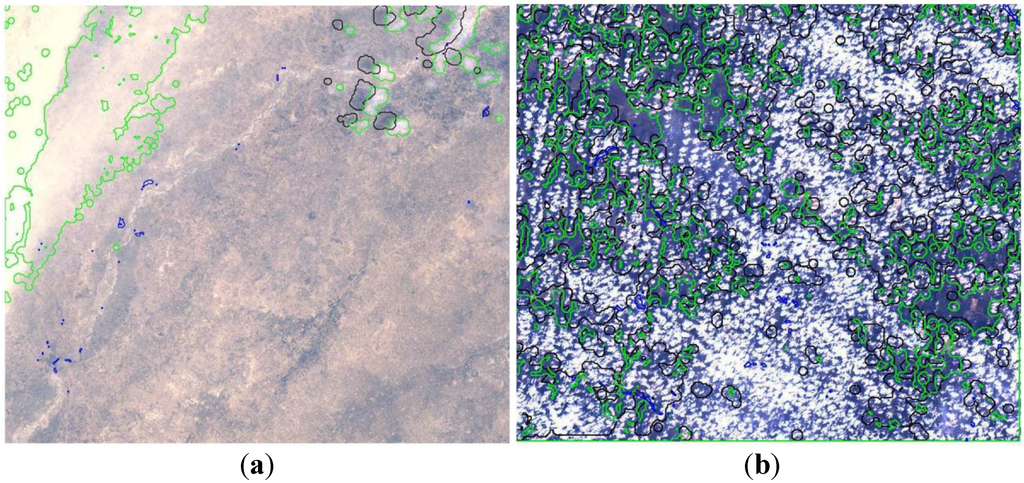 Cloud detection (a) over the Pakistan site (May 25, 2013, top left: 31.74°N–72.46°E, low right: 31.52°N–72.70°E) with haze and clouds over desert and (b) over the Ukrainian site (November 10, 2013, top left: 50.25° N–29.80° E, low right: 49.69° N–30.71°E) with a large number of cumulus clouds. Clouds are circled in green and shadows in black.