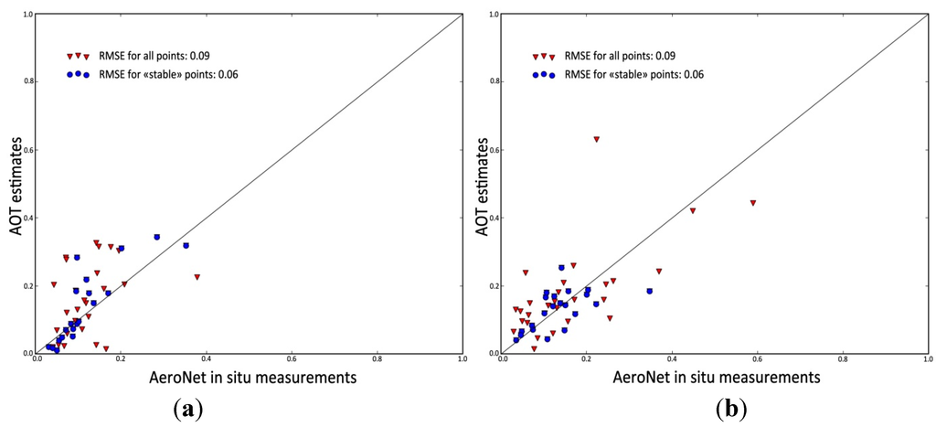 Validation of AOT estimates at 550 nm determined for (a) SPOT4 (Take 5) images (from []) and (b) Landsat 8 images using Aeronet in situ measurements.