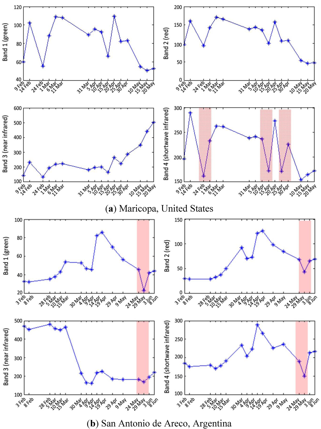 In general, the detected outliers were explained by undetected clouds or shadows, the presence of aerosols, etc. Two issues were noticed in the SPOT4 (Take 5) data sets of Maricopa (United States) and San Antonio de Areco (Argentina), which could be explained by irrigation events (Figure 6). In the case of Maricopa, irrigation explained variations observed in the band 4 (shortwave infrared) for the dates of 15, 20 and 25 April. The same occurred over the Argentinian image of May 29 when the reflectance values in the bands 1, 2 and 3 (green, red, near infrared) dropped in an unexpected way (up to 50% for the bands1 and 2).