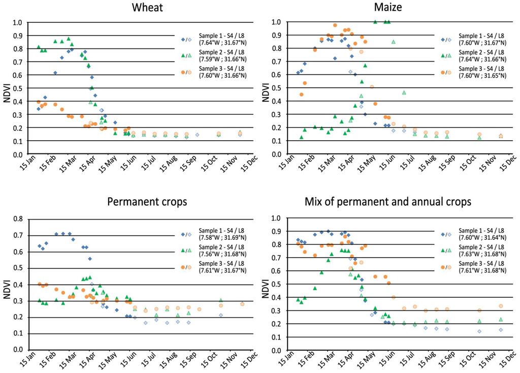 NDVI temporal profiles from parcels of wheat, maize, permanent crops and mix of permanent and annual crops over the Moroccan site. For each crop, temporal profiles of three parcels are provided, plain and hatched dots showing NDVI values obtained from SPOT4 (Take 5) and Landsat 8 images respectively.