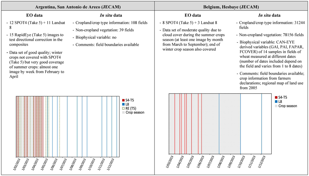 This paper presented the activities underlying the building of such a data set, which consists of satellite imagery and in situ measurements acquired in 2013 over 12 sites spread over the world. The main source of the EO data was the SPOT4 (Take 5) experiment, complemented with Landsat 8 and RapidEye imagery. In situ crop measurements were shared by JECAM network members and other teams in the field.
