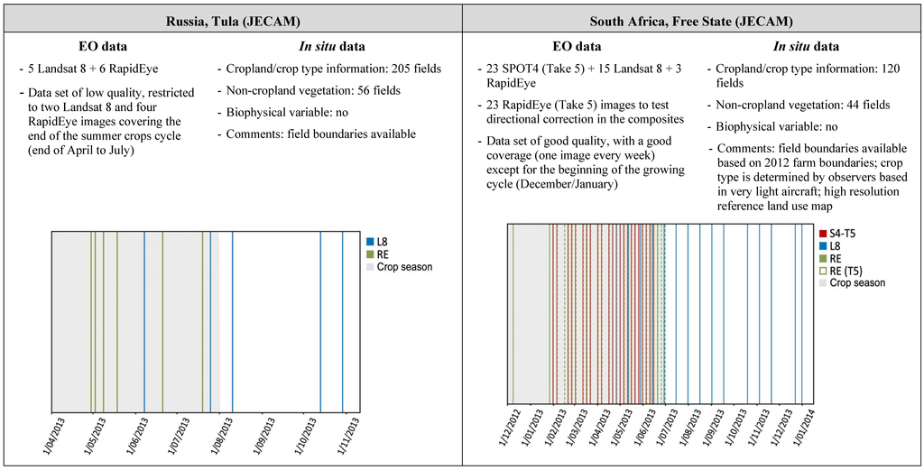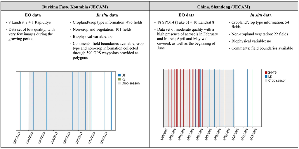 This duo of EO and in situ data was used as input for benchmarking algorithms and selecting the most suitable ones to be included in an operational agriculture system. Benchmarking provided crucial support for the twofold ambition of the project, which is to support timely and accurate crop information at local scales while also supporting accurate monitoring of widely varying agricultural systems at global scales. These ambitions could only be ensured since the TDS is representative of the diverse agricultural practices and climate types over the world and is made of both EO and in situ data acquired in enough quantity during the same season. The site selection and benchmarking approach adopted in this project has allowed algorithms and methods to be compared across sites [,,]. So far, very few examples of this kind of across-sites study exist. This can probably be explained by the logistics, coordination and costs needed to build the necessary data sets. Yet, these studies are highly important to improve our understanding of the current agriculture monitoring capacities. They are the prerequisite to bridge the gap between research and operational methods for agricultural remote sensing.