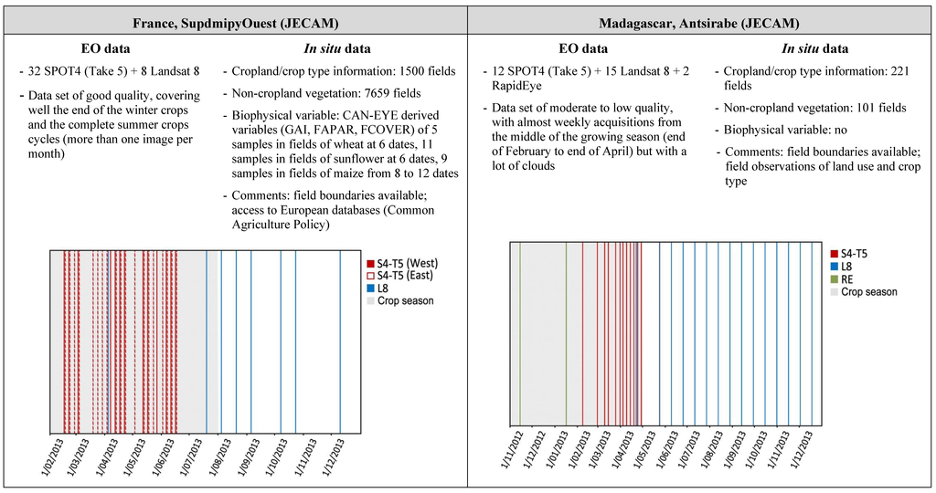 Up to now, most operational monitoring systems rely on proxies and qualitative indicators based on medium to coarse spatial resolution sensors [,,,,,,,,,]. While the potential of high spatial resolution imagery is widely recognized, most of the research activities in this area currently rely on one site, one crop and one sensor. There is thus still a gap between research and operational methods. The Sentinel-2 mission will certainly contribute to bridge this gap by providing high quality imagery but the only availability of data will not solve the issue. Supporting the development of operational agriculture monitoring methods based on high resolution images will first require collecting both EO and in situ data coming from the same season. Second, enough in situ data are to be acquired over each site to allow both algorithm calibration and independent validation of each product. Third, the data has to be collected as much as possible over a selection of sites representative of the huge diversity of agricultural systems in order to tackle the global dimension. Finally, in the case of this research which took place before the Sentinel-2 era, the EO data set had to mimic the “Sentinel-2 like conditions”, emphasizing decametric spatial resolution and 5–10 day temporal revisits.