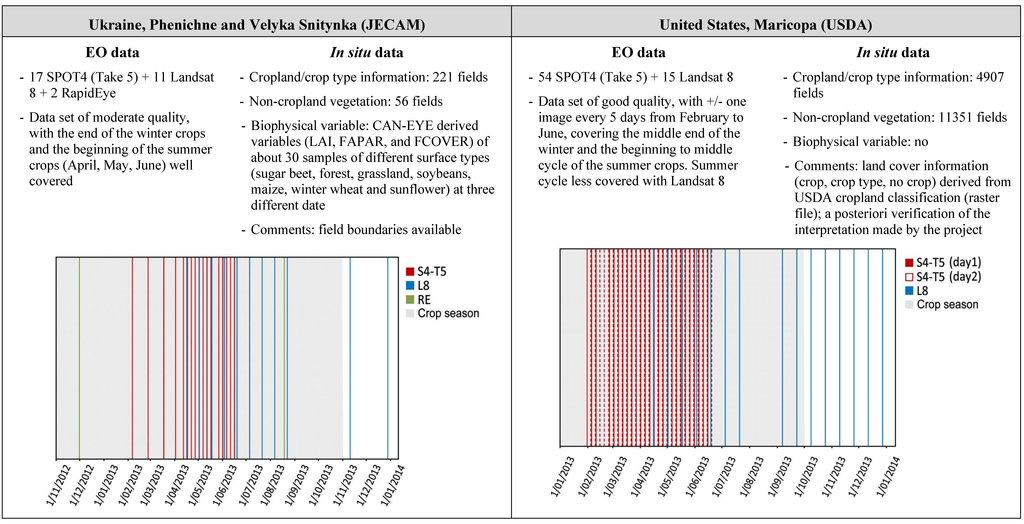 Developing better agricultural monitoring capabilities based on Earth Observation data is critical for strengthening food production information and market transparency. The Sentinel-2 mission has the optimal capacity for regional to global agriculture monitoring in terms of resolution (10–20 meter), revisit frequency (five days) and coverage (global). In this context, the European Space Agency launched in 2014 the “Sentinel2 for Agriculture” project, which aims to prepare the exploitation of Sentinel-2 data for agriculture monitoring through the development of open source processing chains for relevant products. The project generated an unprecedented dataset, made of “Sentinel-2 like” time series and in situ data acquired in 2013 over 12 globally distributed sites. Earth Observation time series were mostly built on the SPOT4 (Take 5) data set, which was specifically designed to simulate Sentinel-2. They also included Landsat 8 and RapidEye imagery as complementary data sources. Images were pre-processed to Level 2A and the quality of the resulting time series was assessed. In situ data about cropland, crop type and biophysical variables were shared by site managers, most of them belonging to the “Joint Experiment for Crop Assessment and Monitoring” network. This data set allowed testing and comparing across sites the methodologies that will be at the core of the future “Sentinel2 for Agriculture” system.