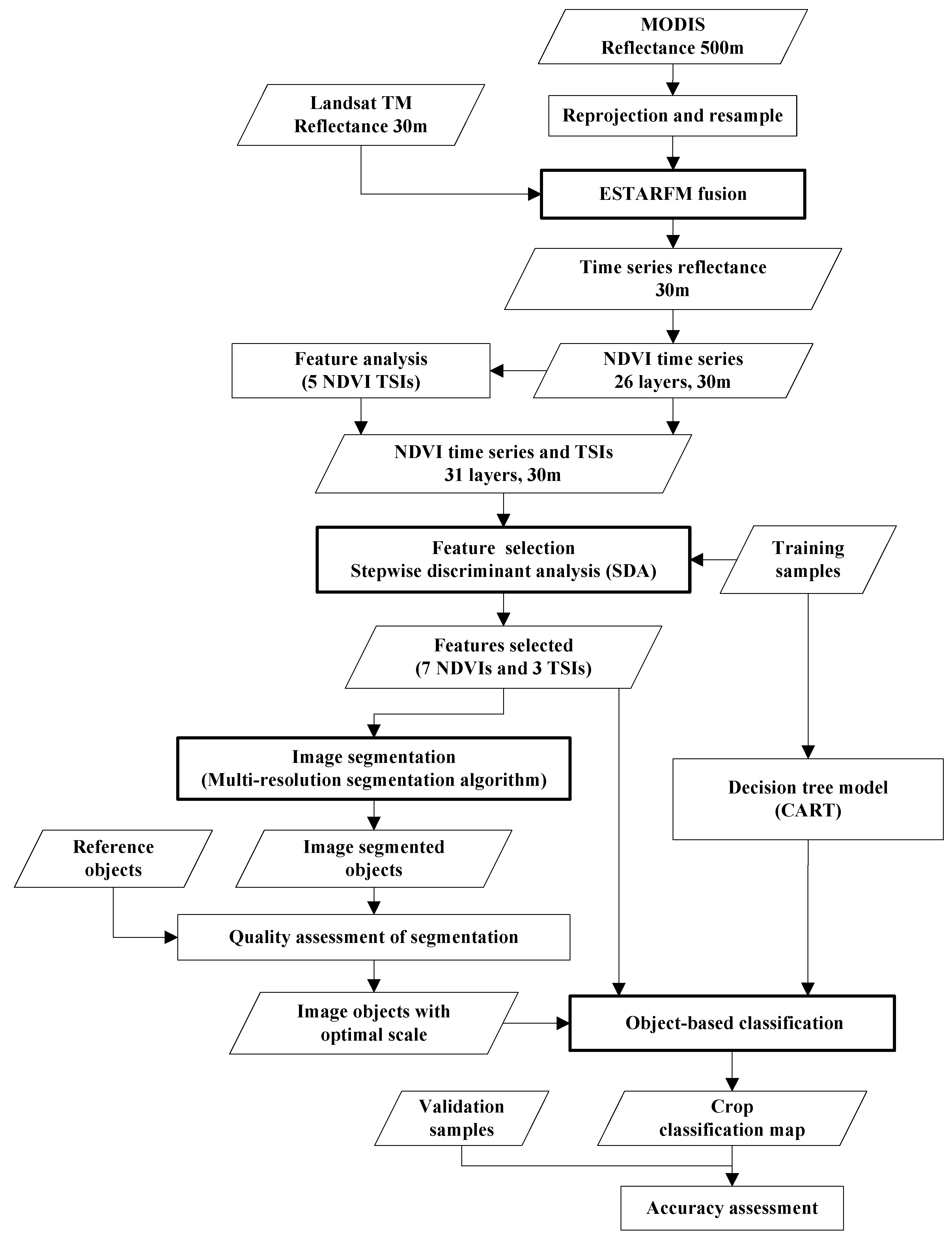 An integrative analysis of feature selection, Object-Based Image Analysis (OBIA) segmentation, and decision tree classifier was explored for crop classification from high temporal-resolution Landsat-MODIS Enhanced NDVI time series. Feature selection improved the accuracy of segmentation and classification, and also reduced the computational cost of image analysis. The optimal scale parameter for segmentation was determined by quantitative measures. The decision tree classifier using object-based metrics generated an overall accuracy of 90.87%. The proposed classification procedure can be applied to large-area cropland mapping and agricultural monitoring. For algorithm improvement, more features can be integrated and assessed to discriminate crop types with similar phenological characteristics in future studies. Despite the fact that uncertainties caused by image alternatives, georegistration, atmospheric correction, cloud residues, and the image fusion can be reduced by the smoothing of NDVI series and feature selection, the quantitative assessments of these factors should be further explored in order to generate optimized dense NDVI time series for crop classification.