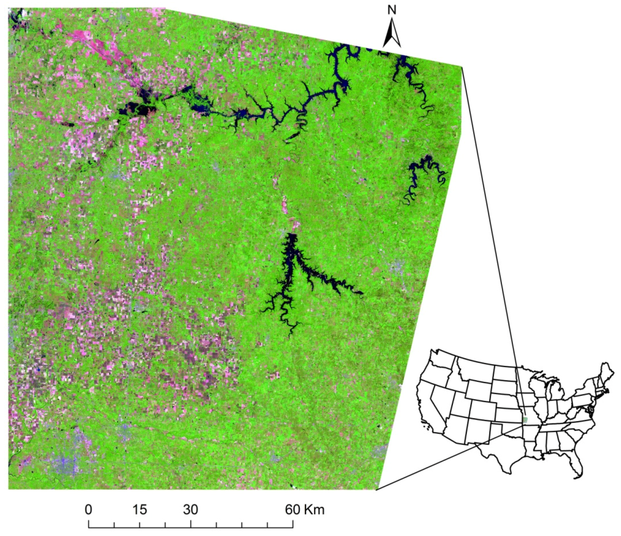 The study area was located in the lower Osage Plain in Southwest Missouri (Figure 2). In 2007, crop types in the study area were extracted in the Cropland Data Layer (CDL) product developed by National Agricultural Statistics Service (NASS), United States Department of Agriculture (USDA), using multi-temporal imagery acquired with the 56-m Indian ResourceSat-1 Advanced Wide Field Sensor (AWIFS) [41]. Major annual crops in the study area are corn, soybean, winter wheat, and winter wheat-soybean double cropping (WWSoybean). Cool-season grass (CSG) dominates the herbaceous pasture lands, while warm-season native prairie grass (WSG) remains in various prairie remnants that are often managed as recreational conservation areas [7]. Accuracy of the CDL data was around 85%–95% for major crop-specific land cover categories. Its accuracy in this grass-dominant study area is expected to be lower. The CSG and WSG are all classified as grass in CDL data. Non-crop lands (forests, water, urban development, etc.) were extracted from the 2007 CDL map and masked out in this study.