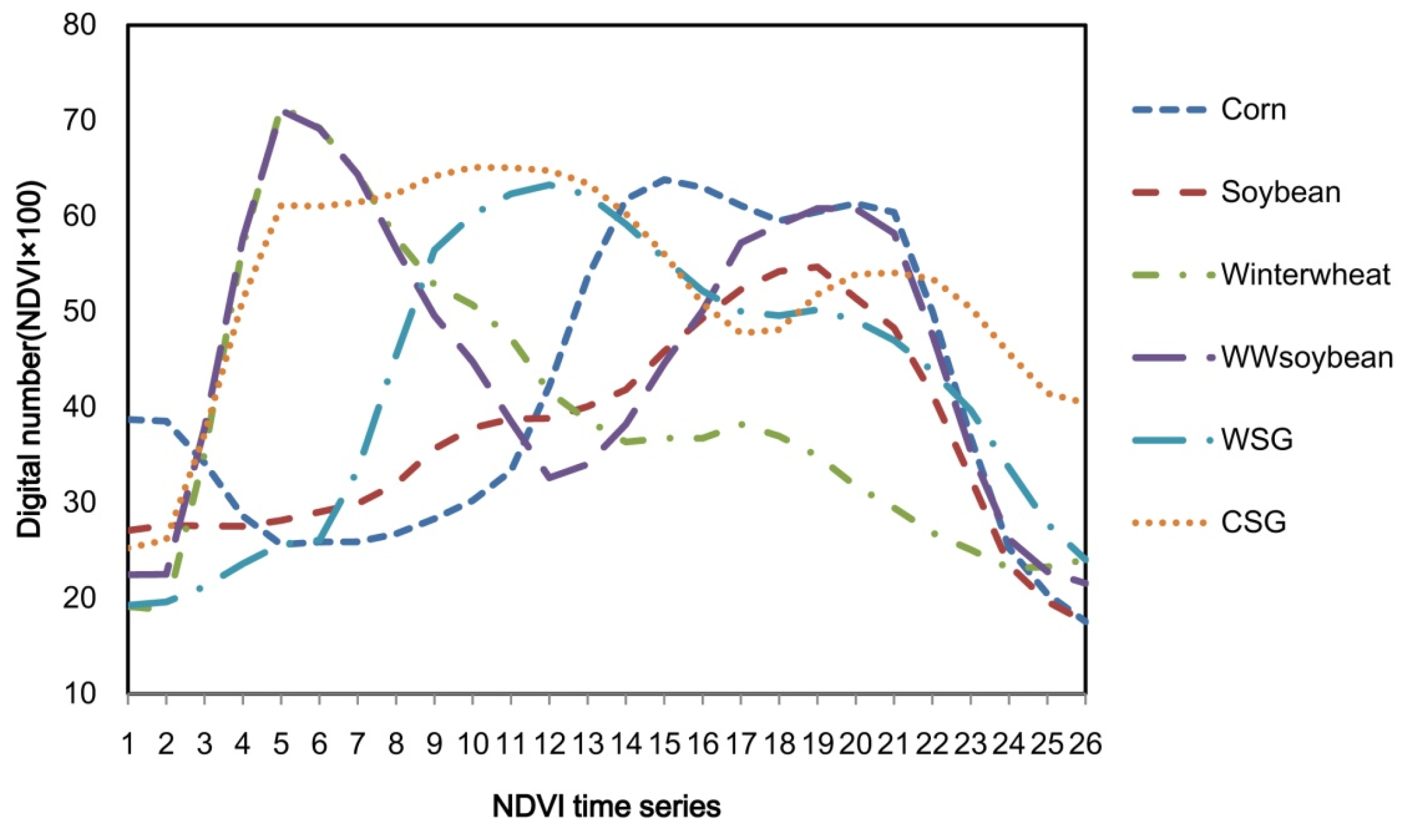 As shown in Figure 3, annual crops have shorter growth seasons than grasses. Corn was planted slightly earlier than soybean, but their curves were quite similar. Winter wheat was characterized with the earliest peak in NDVI (in April–May). The winter wheat-soybean (WWsoybean) double cropping had the earliest peak in NDVI in April–May and a second NDVI peak in fall. Cool-season grass (CSG) started its growth in early spring and reached peak growth in April to May, while warm-season grass (WSG) started in later spring and had delayed peak dates. In addition, CSG turned into dormancy in summer and has a second growth peak in fall, while WSG just remained green in summer.