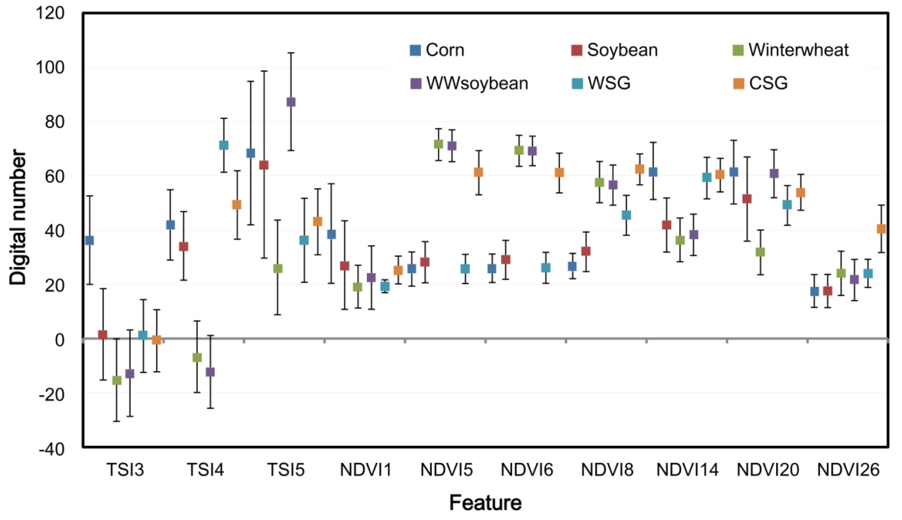 Means and standard deviations of training samples of the 10 selected features for six crop types are shown in Figure 5. NDVI 6 can split the samples into two groups (high NDVI and low NDVI). TSI 3 can separate corn from other crops because corn has high TSI 3 values while those of other crops are close to zero, or even negative. WSG has higher value of TSI 4 than corn and soybean and CSG has higher TSI 4 than winter wheat and WWsoybean. WWsoybean has higher TSI 5 than winter wheat. Therefore, it is reasonable that these four features were used in image segmentation and DT classification.