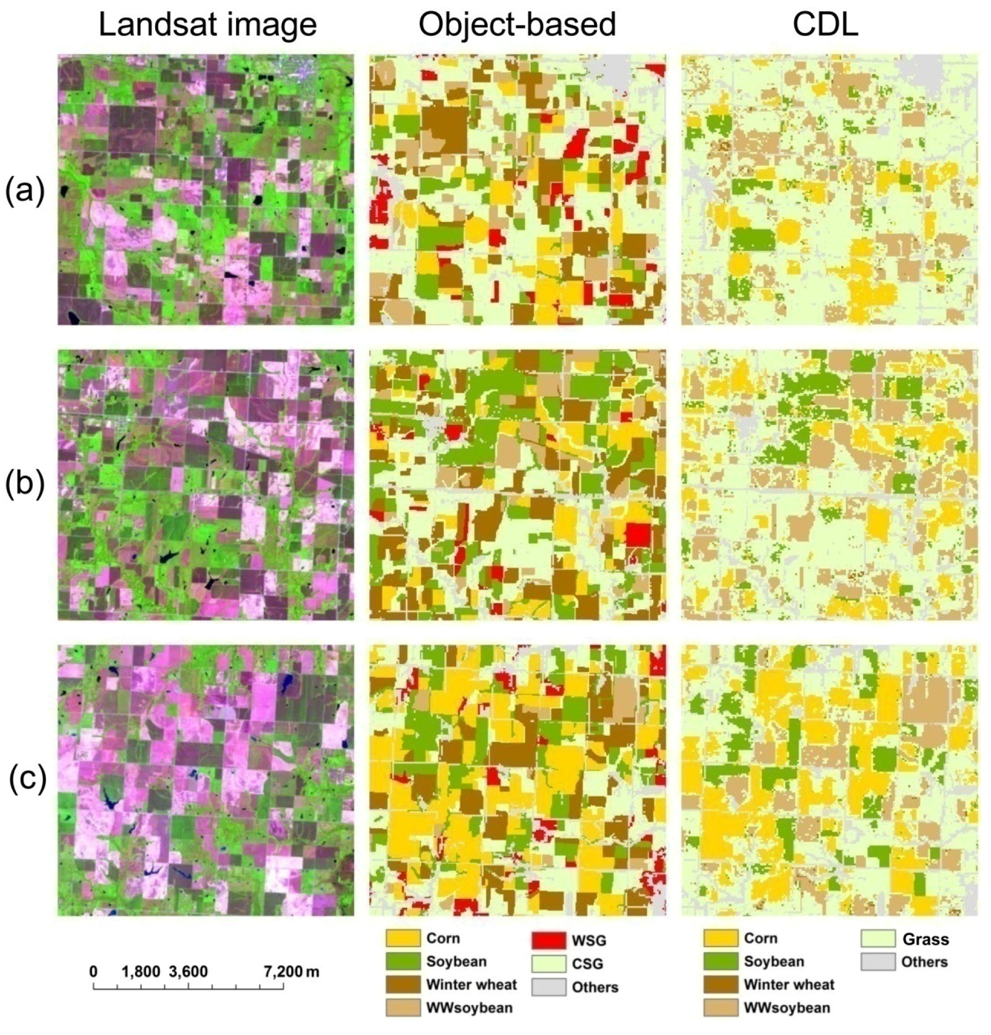 In Figure 9, the object-based classification is visually compared with CDL product in three subsets of the study area (a, b, and c, with their locations shown in Figure 8). In our results, crop fields were discriminated better than CDL. Classification noises caused by in-field spectral variations were also removed. The winter wheat and WWsoybean were discriminated in he object-based result, but they were mixed and most of winter wheat was classified as WWsoybean in the CDL map. Superior to the CDL product, our classification delineated WSG from CSG grasses based on their asynchronous seasonality.