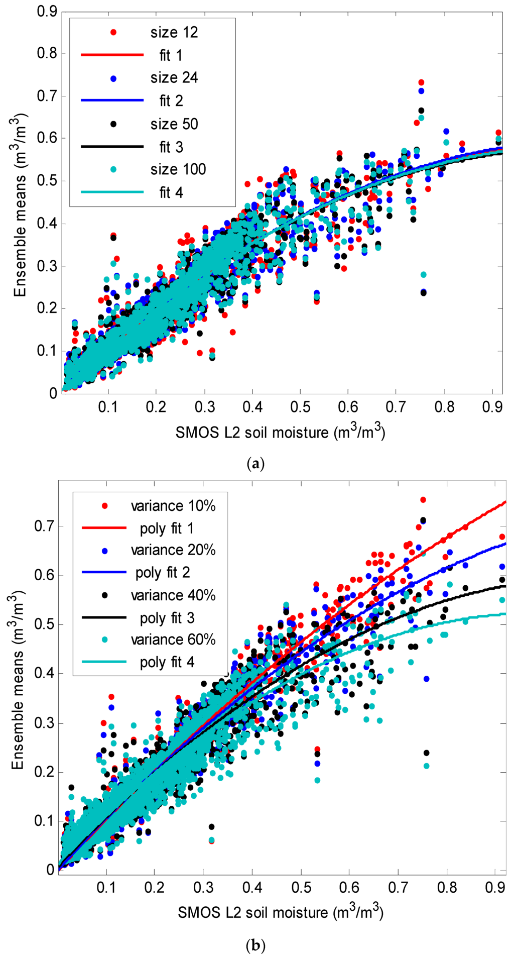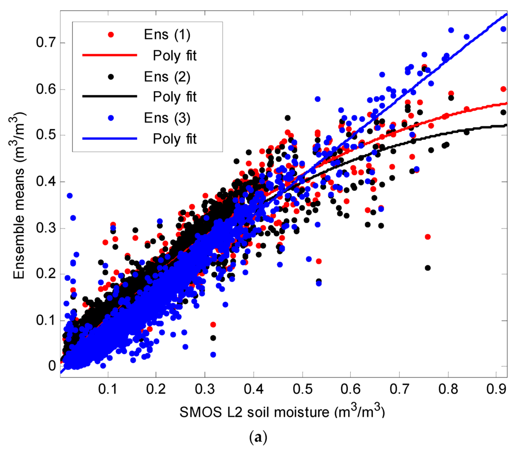 For producing rescaling functions, the different ensemble means generated from different perturbation schemes stated above corresponded to the original SMOS soil moisture end products. The fitting curves followed the second-order polynomial fitting because it showed high goodness-of-fit statistics above 0.9 as compared to other types of fit tested (e.g., Gaussian, exponential, power, rational, and sin functions).