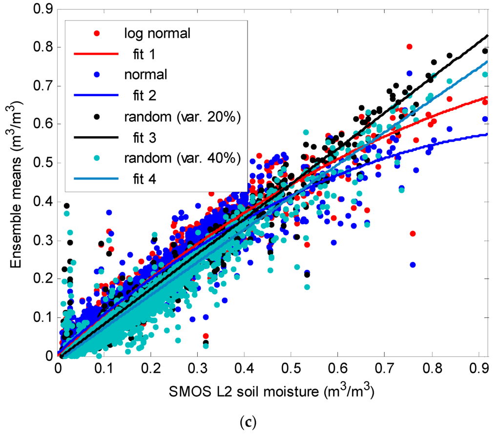 Three rescaling functions to convert the original SMOS soil moisture product to the retrieval ensemble mean were selected from 12 cases of Figure 1, and are shown in Figure 2a. The selection was to compare the effects of the ensemble size, the variance, and different error distribution. In more detail, each ensemble group was generated by a normal distribution with a variance of 40% and an ensemble size of 100 (indicated by “Ens. (1)” below), by a normal distribution with a variance of 60% and an ensemble size of 24 (indicated by “Ens. (2)” below), and by a random distribution with a variance of 40% and an ensemble size of 12 (indicated by “Ens. (3)” below), respectively. Three rescaling functions are shown below: