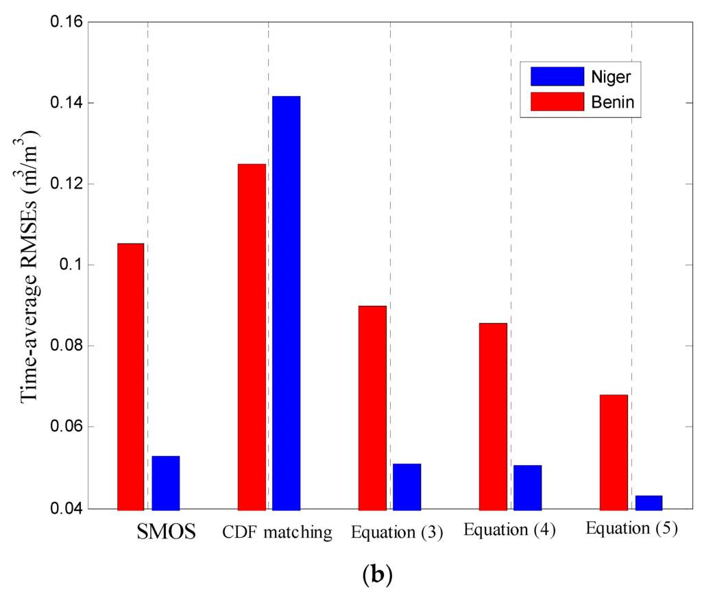 The SMOS overestimation is shown in Figure 2a, where SMOS soil moisture exceeded the hydrologically sensible levels of saturation points to exhibit spuriously high values up to 0.9 m3/m3 on the x-axis. In Figure 2b, the time-average of RMSEs from DoPlY 150 to 240 (time range also shown in Figure 3a) in 2010 shows that such overestimation was mitigated by retrieval ensembles. As compared to Niger (dry and sandy bare soils), the SMOS overestimation was especially large in Benin (moderately wet and vegetated areas), as illustrated by the first column of Figure 2b. This is attributed to vegetation attenuation, considering the spatial distribution of the leaf area index (LAI) (see Supplementary Material Figure S1). At the second column of Figure 2b, CDF matching increased the RMSEs of SMOS data at both sites. However, all the ensemble rescalings at the third to fifth columns of Figure 2b appropriately diminished the original SMOS overestimation. In particular, it was noted that Equation (5) made a reasonable correction with a smaller ensemble size of 12 than Equation (3) at 100 and Equation (4) at 24, which implies that a large ensemble size is not a requirement for improving performance.
