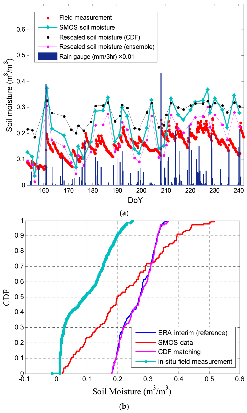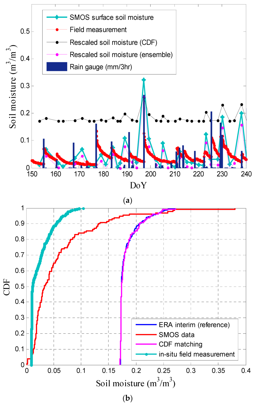 Soil moisture in Niger: (a) time-series comparisons; (b) cumulative distribution of reference data (ERA interim), SMOS data, CDF matching, and field measurements.