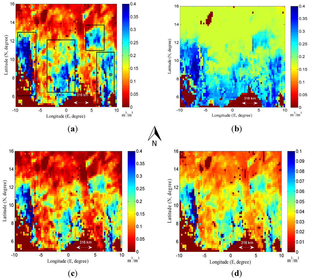 As compared to the original SMOS data in Figure 5a, CDF matching in Figure 5b furthermore overestimated soil moisture over the entire study domain, due to the intrinsic errors in the ERA interim reference data, as discussed above. In contrast, Figure 5c shows that an ensemble approach (i.e., Equation (5)) effectively mitigated SMOS overestimations, appropriately representing dry soils. Those overestimation parts shown in black boxes “A” and “B” were alleviated in Figure 5c. Vegetated areas shown in black boxes “C” and “D” were also mitigated in Figure 5c. All the differences before and after ensemble rescalings are indicated by Figure 5d.