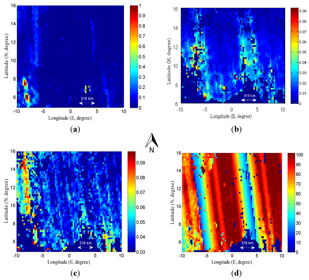 The study domain situated at the sub-Saharan area (5–16° N and 10° W–10° E; see Supplementary Material Figure S1) was previously illustrated by Lee et al. []. There is a clear latitudinal gradient over this study domain. The Niger supersite (i.e., 50 km by 40 km) in the Sahel region is very dry. The dry air mass from the North is transported across the Sahara. In contrast, the Benin supersite in the Guinean region is moderately wet. Vegetation types in Benin include forest, fallows, and crops []. The vegetated area in Benin is influenced by moist air from the Gulf of Guinea. The rainfall gauge network data in Benin showed 1289.09 mm during the experiment period, while it was 358.52 mm in Niger []. The Analyses Multidisciplinaires de la Mousson Africaine (AMMA) field campaign for this region was established in Benin and Niger for the purpose of calibration and validation of satellite data, as previously introduced by [,]. Detailed super-site locations for Benin and Niger are available at http://www.amma-catch.org/. The soil moisture field measurements in 2010 were upscaled by taking a linear spatial average of eight probe measurements deployed at a depth of 5 cm within a single pixel at 0.25 degrees. AMMA field campaign data are available at the international soil moisture network (https://ismn.geo.tuwien.ac.at/).