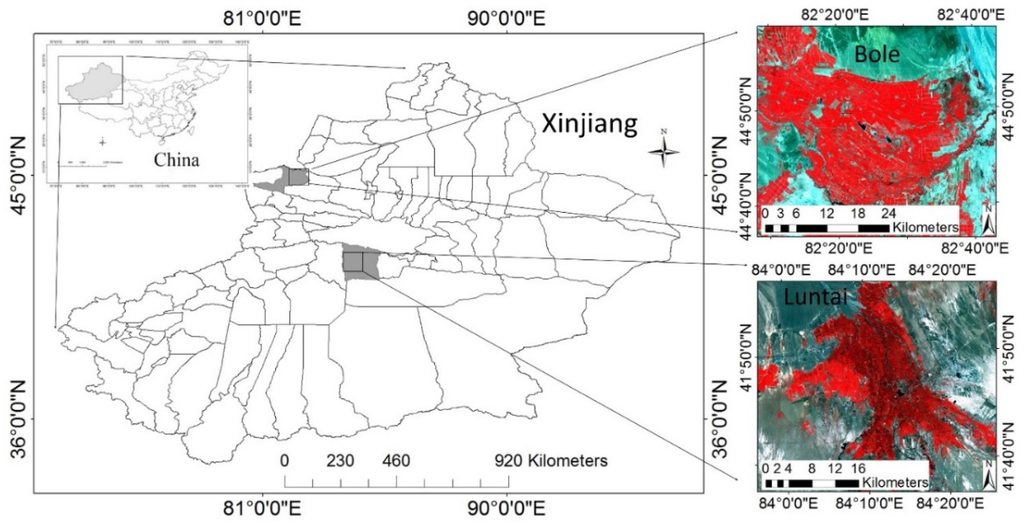 Two counties located at Xinjiang Province, China, were selected as the study areas (Figure 1). One county is Bole located at the northwestern part of Xinjiang (44°36’–44°58′N and 82°05′–82°40′E). It is in a continental arid semi-desert and desert climate. The main land cover types are agriculture (cotton and corn) and deserts. Another county is Luntai (41°39′–41°56′N and 84°00′–84°21′E), located at Bayinguoleng Mongolian Autonomous Prefecture, between Southern Tianshan and north of the Tarim Basin. It has a warm temperate continental arid climate. Luntai also consists of plains covered by agricultural lands, cities, and deserts. The main crops of Luntai are cotton, corn, and winter wheat.