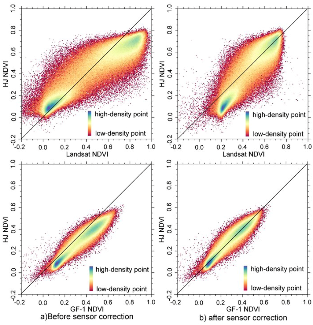 The scatter plot comparisons of Landsat Normalized Different Vegetation Index (NDVI) data, Gaofen satellite no. 1 wide field-of-view camera (GF-1 WFV) NDVI, and Huanjing satellite (HJ) NDVI data (a) before and (b) after sensor calibration.