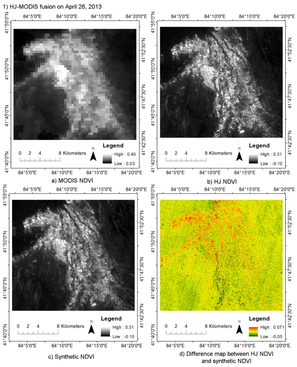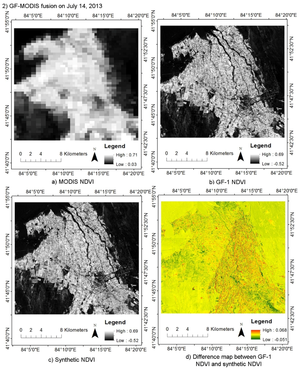 The data-fusion approach is to enhance the high spatial and temporal remote-sensing data. Recently, several data fusion approaches have been proposed to combine moderate-resolution data with high temporal and coarse spatial resolution data to generate daily moderate-resolution data. These approaches have been widely used in monitoring land surface and environmental processes. The Spatial and Temporal Adaptive Reflectance Fusion Model (STARFM) proposed by Gao et al. [] is the most widely used model for blending Moderate Resolution Imaging Spectroradiometer (MODIS) and Landsat imagery. It was applied successfully in the production of daily land surface temperature data, forest disturbance mapping, and studies of environment monitoring [,,,,]. However the STARFM method showed a low accuracy in complex heterogeneous areas. To address this problem, Zhu et al. [] proposed an enhanced STARFM (ESTARFM). The accuracy of STARFM and ESTARFM were assessed by Emelyanova et al. []. Data fusion was also built up on linear mixed models [,,]. The Spatial and Temporal Data Fusion Approach (STDFA) proposed by Wu et al. [,] is a widely used spatial and temporal data fusion model based on unmixing methods. It was applied successfully for generating daily 30 m leaf area index [] and land surface temperature data []. A comparison shows that STARFM and ESTARFM are more suitable for complex heterogeneous regions while unmixing methods are more suitable for cases that downscale the spectral characteristics of medium-resolution input imagery [].
