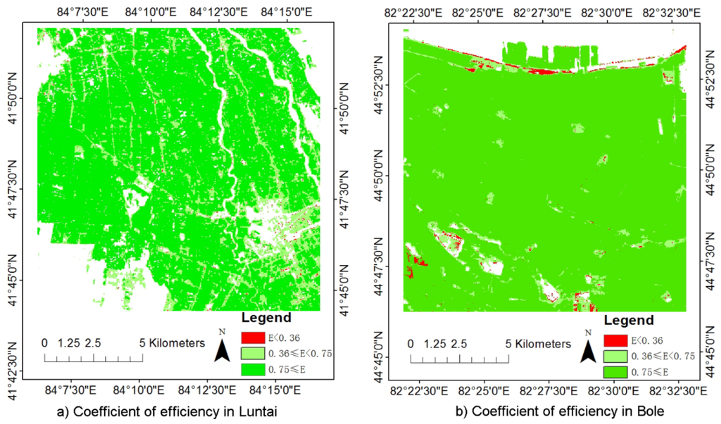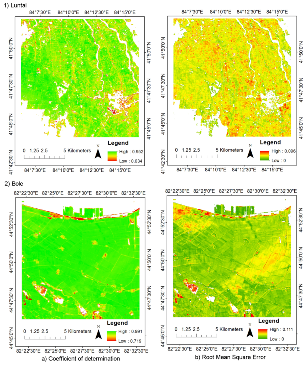 By fusing daily MODIS data with HJ CCD, Landsat and GF-1 WFV data using STDFA, daily 30 m synthetic NDVI data were generated. There were 54 synthetic DNVI data in Luntai and 69 synthetic DNVI data in Bole. Figure 3 shows a synthetic HJ NDVI for 26 April 2013 and a synthetic GF NDVI for 14 July 2013. Through visual-interpretation method, we can find that the synthetic NDVI are very similar with the actual NDVI. Both the synthetic and actual NDVI have a higher spatial resolution that the MODIS NDVI. The evaluation of these two synthetic NDVI data using HJ NDVI and GF NDVI shows that the r value is greater than 0.97 and RMSE error is less than 0.04 (Table 5). It shows that the synthetic NDVI using the STDFA method is very similar to actual NDVI data. Consistent with the results of Wu et al. [], the STDFA method showed a better performance in homogeneous land cover types (desert and large area farmland) than in heterogeneity plots (small area woodland). Consistent with the results of Wu et al. [], the STDFA method showed a better performance in the GF-MODIS fusion than in the HJ-MODIS fusion, because the GF-1 data have a higher quality than the HJ CCD data. The geometric registration error also showed an important influence in the performance of STDFA. Due to the geometric registration error of the lower right part of GF-1 WFV data being larger than in the upper left part, a smaller difference between the synthetic and actual GF-1 WFV data (14 July 2013) was obtained by the STDFA in the upper left part.