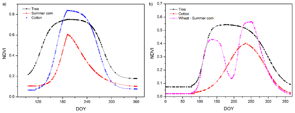 Phenology for different land cover types extracted from actual MODIS NDVI data in (a) Bole and (b) Luntai.