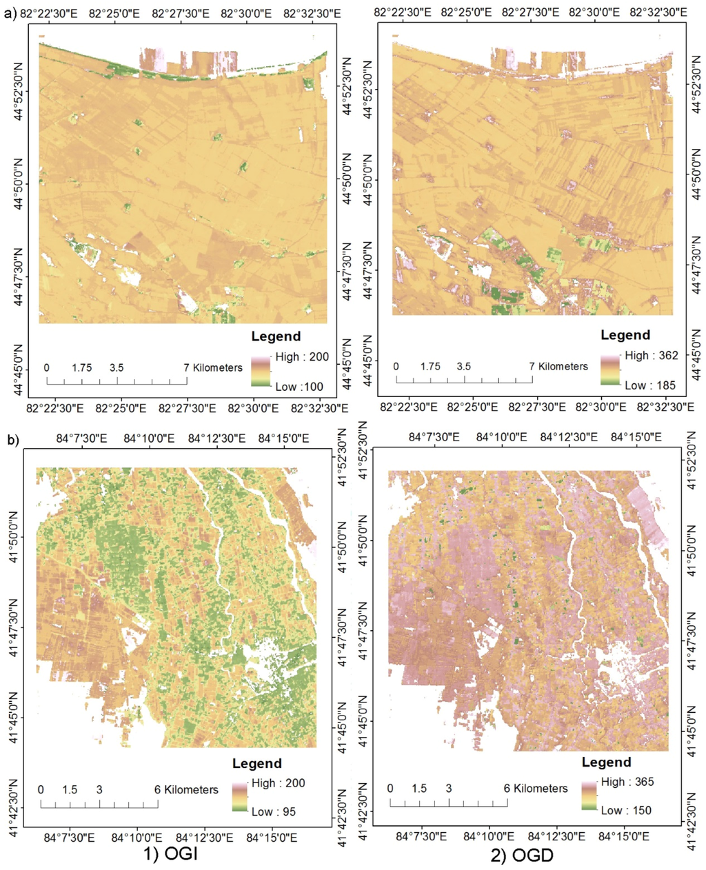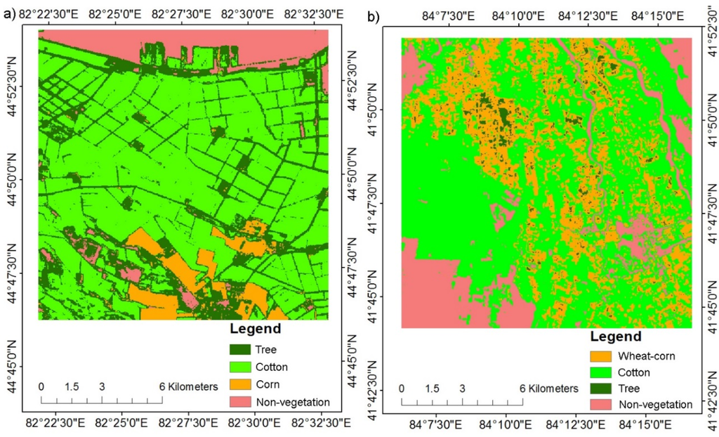 Due to the spectral characteristics of different vegetation are very similar, distinguishing different types of vegetation using multispectral images is quite difficult. However, the crop calendars of the main crops in Bole and Luntai are different (Table 3), allowing us to take advantage of crop phenology information to map crops. Crops in Bole and Luntai were mapped using the phenology information by three steps. First, the vegetation area was extracted using the threshold method. In time series NDVI data, pixels with NDVI greater than 0.2 for a month were classified as vegetation. Other pixels were classified as non-vegetation. Then, the planting patterns for all pixels were extracted according to the number of peaks in the time series NDVI data. According to the ecosystem rules, span between peaks for forest, shrubland or grassland and crops should be longer than four months, two months, and 1.5 months, respectively [], and the land cover types in Luntai and Bole are crops and forest. Thus, pixels with two successive peaks (the time between two peaks being longer than one and a half months) were classified as wheat-corn while the planting patterns of other pixels were set to one crop. Finally, pixels with one-crop planting patterns were classified as tree, cotton, and summer corn, using the maximum likelihood method with two thirds of the field survey data as ROIs for OGI and OGD data.