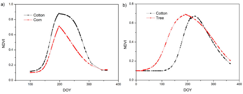where t is time in the day of the year (DOY), a is related to the vegetation growth time, b is associated with the rate of plant leaf development, c is the amplitude of NDVI variation, d is a vegetation stress factor, and NDVIb is the background NDVI value. This model can be applied to detect seasonal vegetation growth successfully, using AVHRR data [,] and MODIS data [,,,].