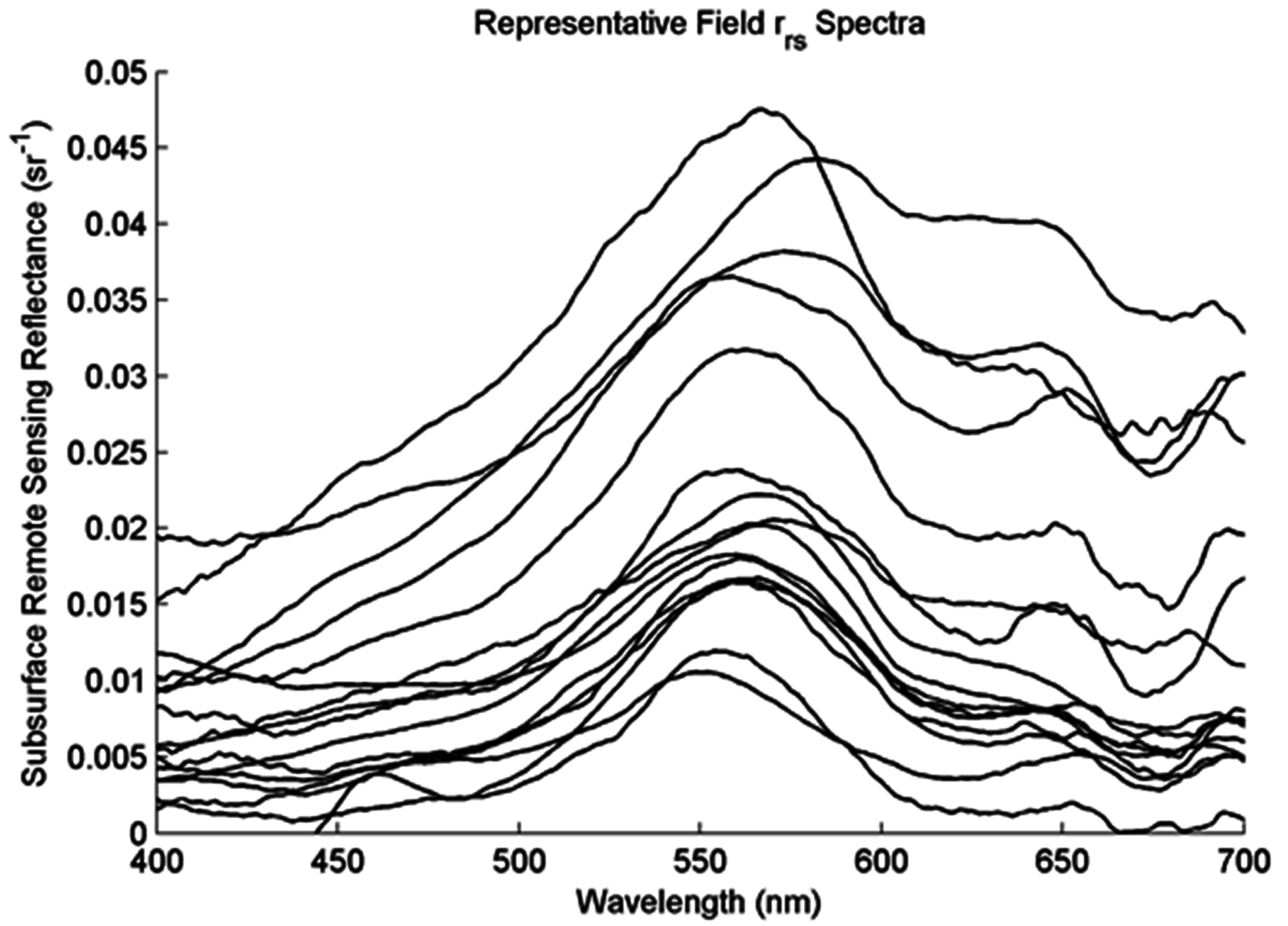 In this paper, we adopt the terminology of Lee et al. [12,13], where Rrs refers to the ratio of upwelling radiance to downwelling irradiance measured just above the water surface, and subsurface remote sensing reflectance, rrs, refers to the same ratio translated through the air–water interface.