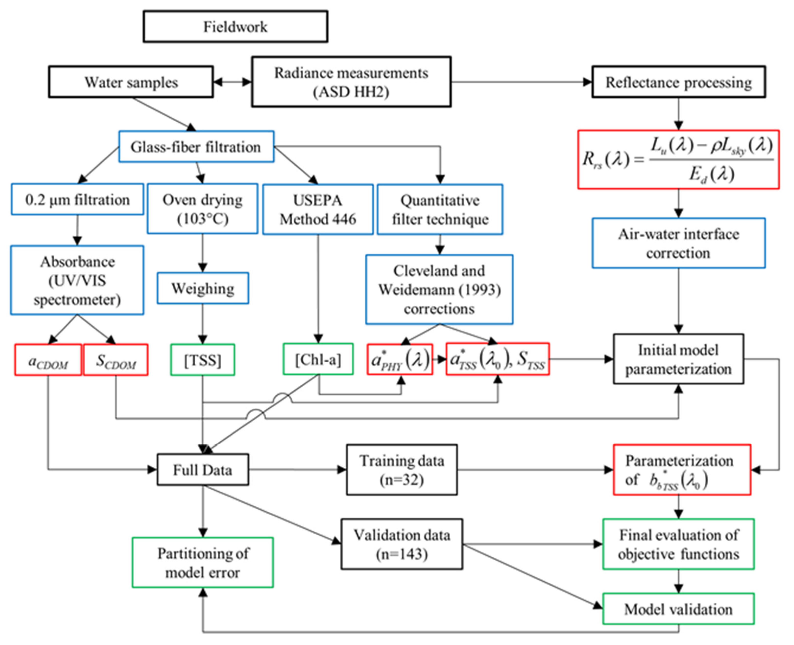 Full workflow used to collect and process field data, optimize and validate the semi-analytical algorithm, and perform statistical analyses. Green outlines refer to final products, red outlines to optical parameters, and blue outlines to intermediate processing steps. [TSS] and [Chl-a] refer to the concentrations of total suspended solids and chlorophyll-a, respectively.