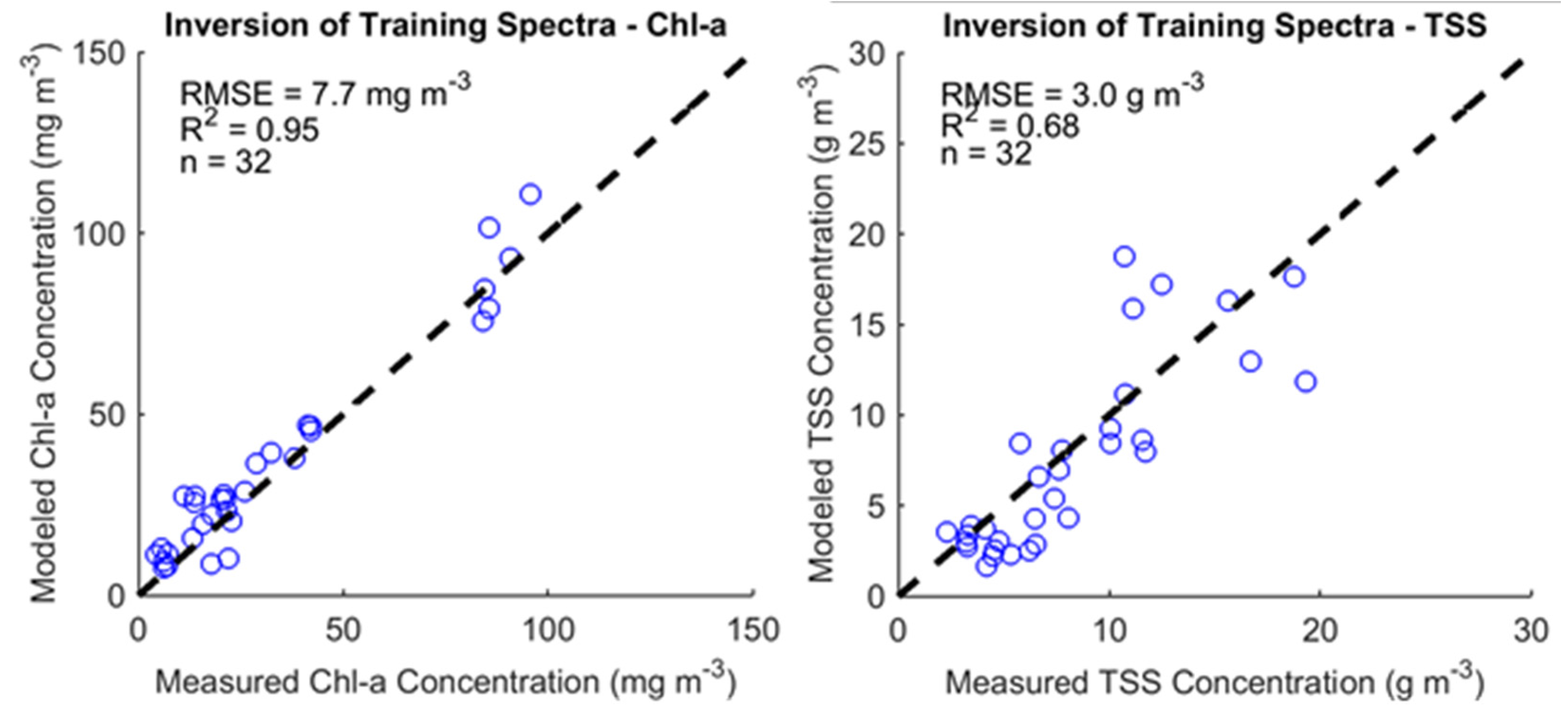 After parameterization, we compared the algorithm results when applied to spectra collected with an at-nadir viewing angle to results from spectra collected at a 40° zenith angle. We found that the 40° viewing angle produced more accurate TSS estimates, with a TSS concentration retrieval R2 of 0.68 compared to an R2 of 0.40 for the at-nadir viewing angle. Both view angles produced the same R2 for chl-a retrievals. The algorithm was then applied to 40° viewing angle data for the rest of our statistical error and objective function comparative analyses. Our finalized parameterization of the full SA algorithm is outlined in Table 3 [12,19] and the results from this algorithm applied to the training data set can be seen in Figure 7. We calculated the root mean squared error (RMSE) for both constituents. Our algorithm achieved an RMSE of 7.7 mg∙m−3 for chl-a concentration and an RMSE of 3.0 g∙m−3 for TSS concentration.