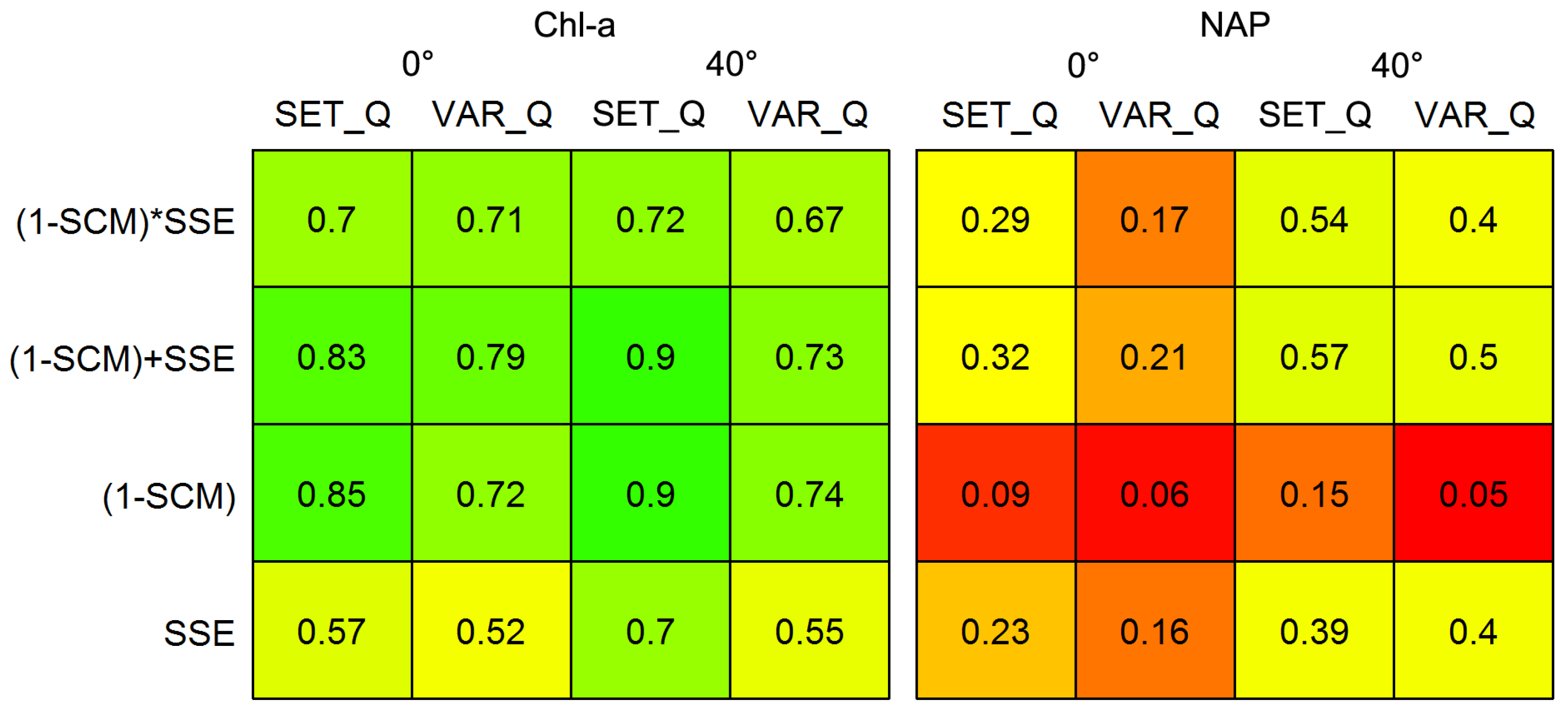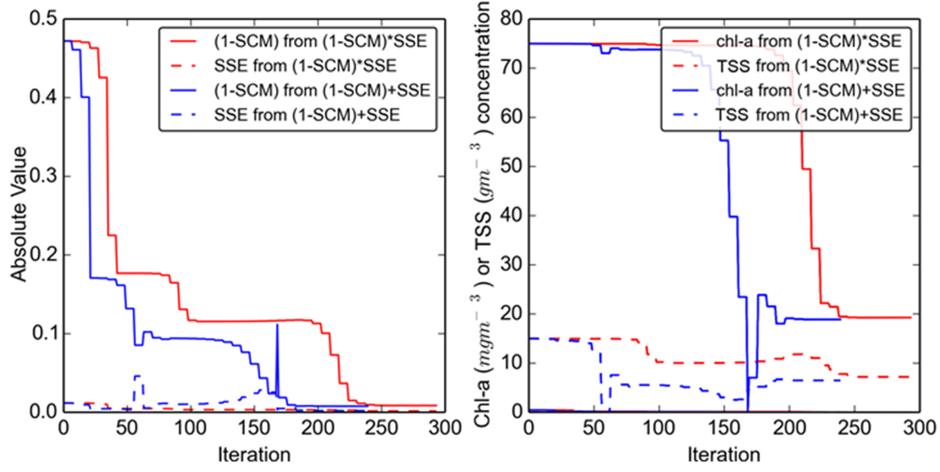 where is rrs averaged over all wavelengths being considered. We evaluate four objective functions incorporating SSE and SCM to determine their relative applicability for multi-temporal reflectance inversion: SSE, (1 − SCM), SSE + (1 − SCM), and SSE × (1 − SCM).