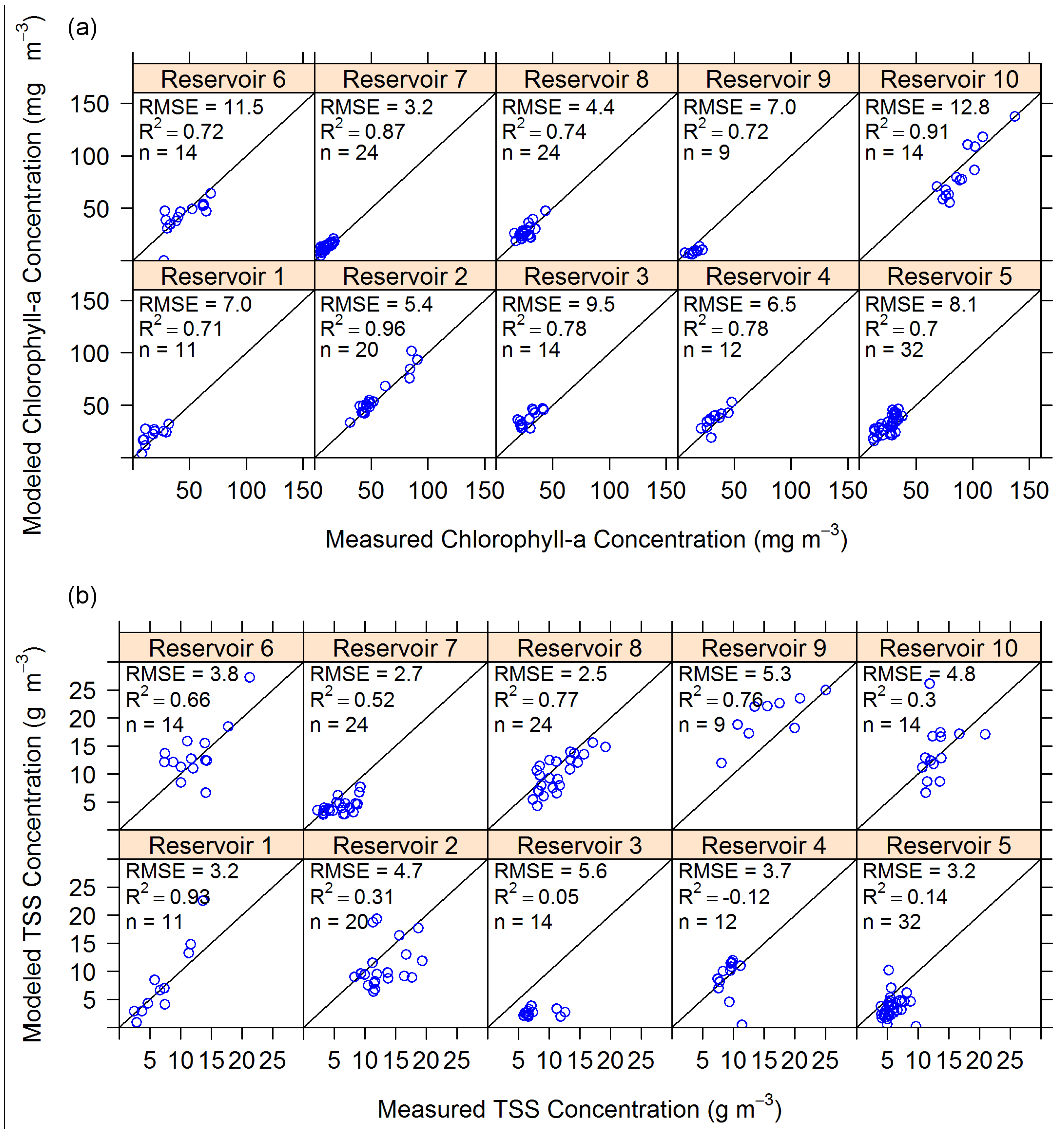 Algorithm results separated by reservoir, including estimates of (a) chl-a concentration and (b) TSS concentration. The thin black lines indicate 1:1 correspondence. RMSE is in mg∙m−3 for chl-a concentration and g∙m−3 for TSS concentration. n is the number of samples displayed in each sub-graph. R2 is the coefficient of determination between modeled and measured values in each sub-graph.