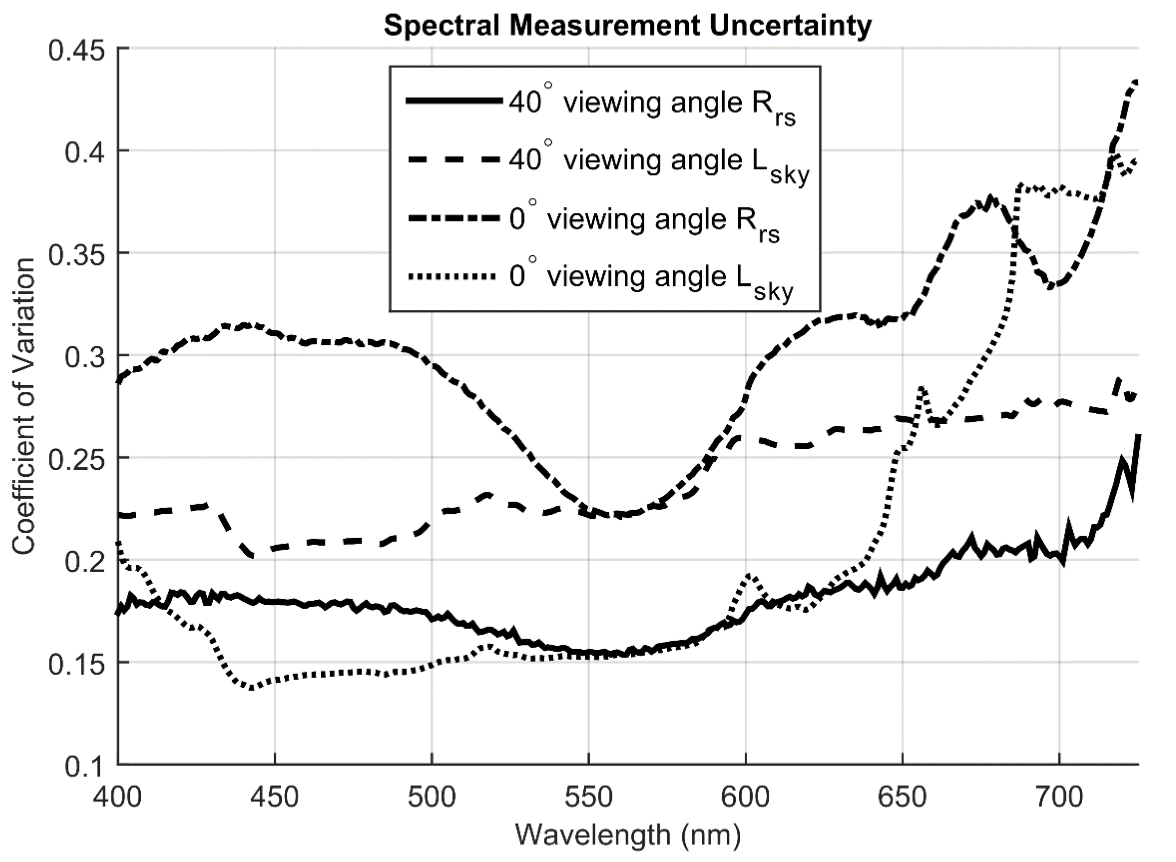 Variability in Rrs measurements using the field spectrometer accounts for the second largest but possibly most problematic source of error in this algorithm. This variability likely results from highly variable cloud cover, deviation from optimal viewing geometry, rapidly changing light fields, and waves on the water surface. We calculated the coefficient of variation between replicate spectrometer Rrs and Lsky measurements and found high uncertainty. The coefficient of variation for Rrs measurements made at a 40-degree viewing angle ranged between 0.155 and 0.26 and averaged 0.18 (Figure 12). The Rrs measurements taken at-nadir had much greater variance between replicates with a coefficient of variation that ranged between 0.23 and 0.43 and averaged 0.3 for this geometry (Figure 12). These wide dispersions are especially problematic because they are difficult to account for in the field and the error they cause is necessarily propagated through the inversion process.