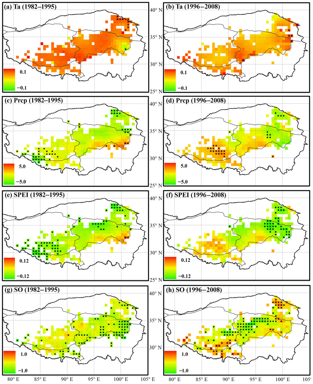 Trends in spring (MAM) air temperature (Ta, °C·year−1; (a,b)), precipitation (Prcp, mm·year−1; (c,d)), SPEI (year−1; (e,f)) and GIMMS3g NDVI-derived spring onset (SO, day·year−1; (g,h)) during the two sub-periods, respectively. Grid cells with black dots denote trends at the 90% (p < 0.1) significance level, while cells without black dots have non-significant trends (p > 0.1).