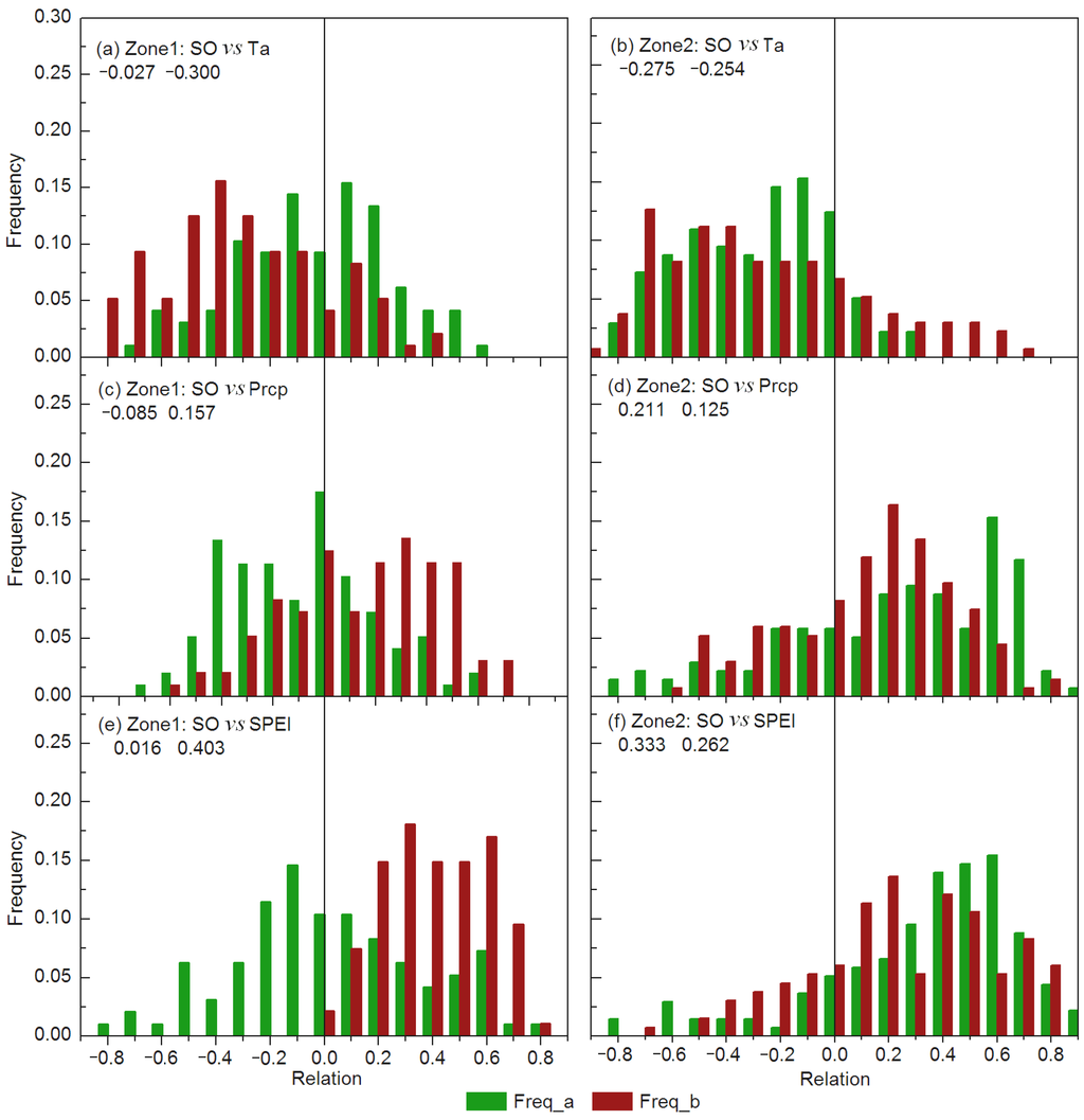 Frequency distributions of correlations between vegetation spring onset (SO) and spring (MAM) air temperature (a,b), precipitation (c,d) and SPEI (e,f) during the two sub-periods in Zone-1 and Zone-2, respectively. All data series were detrended prior to the analysis. Freq_a and Freq_b indicate corresponding frequency distributions of correlations during the two sub-periods. Numbers in the panels denote the regional mean correlations during the two sub-periods.