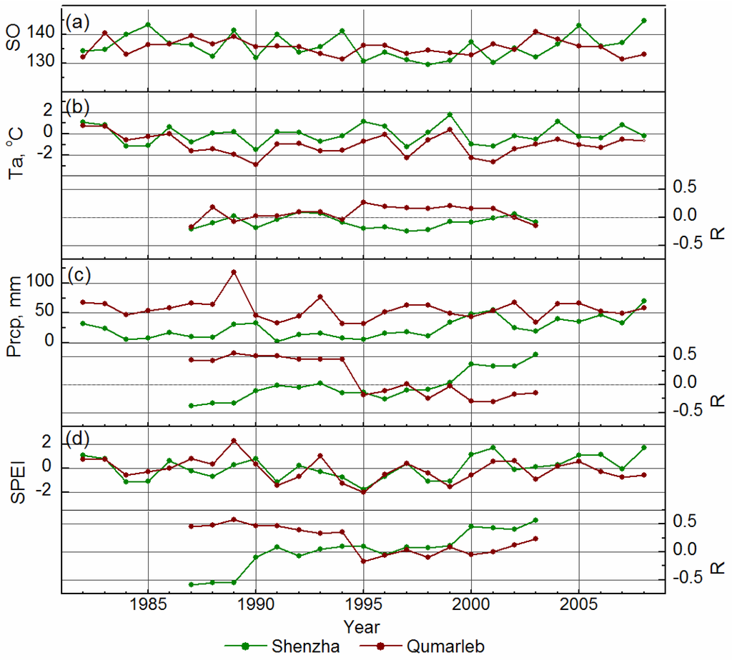 Time series of GIMMS3g NDVI-derived spring onset (SO, (a)), in-situ spring air temperature (Ta, (b)), precipitation (Prcp, (c)) and SPEI (d) from 1982 to 2008 at two respective weather station locations in Zone-1 (Shenzha) and Zone-2 (Qumarleb) of the TP domain. The partial correlation of SO with Ta (or Prcp), while accounting for the influence of Prcp (or Ta) was based on an 11-year moving-window analysis, while the correlation of SO with SPEI was calculated using a Pearson correlation also based on the 11-year moving-window analysis.