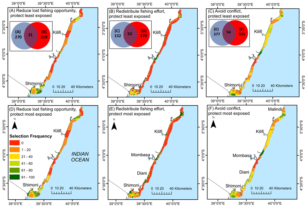 Overlap of the solutions for three different planning scenarios was relatively low, with the highest being the overlap (21 km2) between redistribution of fishing effort and minimizing multiple-use conflicts while minimizing climate exposure. When comparing the single most cost-effective solution this overlap was higher, but still relatively low. Areas adjacent to highly populated areas were avoided by both scenarios because of the many uses and demand for fish near urban areas [47,48]. Minimizing conflicts resulted in the largest area (~29 km2) of the 133 km2 of the existing high compliance closures being selected at a high frequency, perhaps indicating a successful resource allocation decision in the current management system. Prioritization solutions from the fishing effort redistribution scenario appeared to redistribute areas more evenly compared to the more clustered solutions of the other two scenarios. Therefore, from the coral-reef fisheries management point of view, the fishery redistribution scenario would appear to be the ideal solution, as it represented a larger portfolio of the least and most climate-exposed areas, while at the same time being the most cost-effective solution in terms of the lost fishing grounds. Under this prioritization scenario, clusters of priorities were more evenly distributed along the coastline, with priority areas being selected within the existing protected areas and in new locations. New locations that were selected include southern Kenya between Shimoni and Diani, around Diani, south of Mombasa and around Kilifi and South of Watamu in the North.