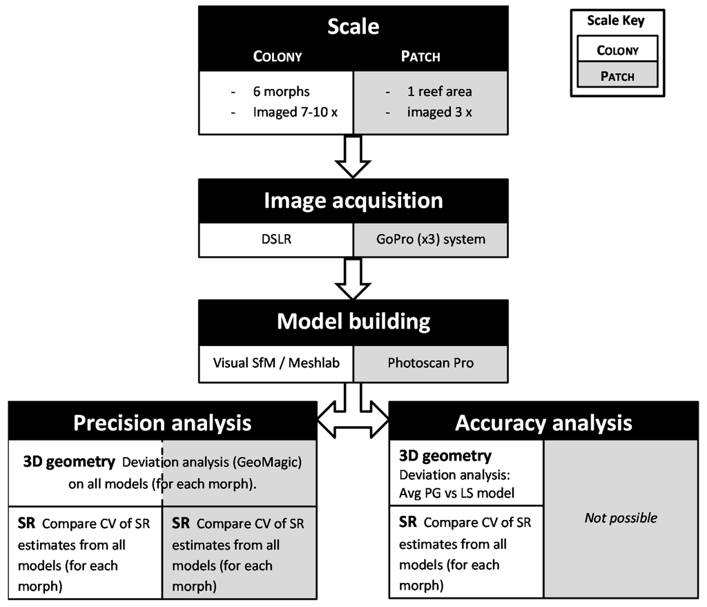 This study evaluated the precision and accuracy of habitat structural complexity metrics derived from high resolution photogrammetric models (mesh resolutions of 1 to 30 mm, depending on the spatial extent) of benthic marine habitats at two spatial extents; sub-meter (coral colonies) and 100s of meters (patches of benthic habitat). All tools used (hardware and software) are off-the shelf (in some cases free) components that can be used by non-experts in computer vision to suit the specific application. Precision was assessed by sampling the same coral or habitat patch multiple times to evaluate the among-sample variation (measurement error). Accuracy was assessed by comparing metrics and 3D geometry of models generated from photogrammetry with those obtained from laser-scanning (0.2 mm mesh resolution, details below). Accuracy assessment was only possible at the colony-scale. By necessity, the data acquisition and processing methodology for these two spatial scales was different as detailed below. The process flow is summarized in Figure 1.