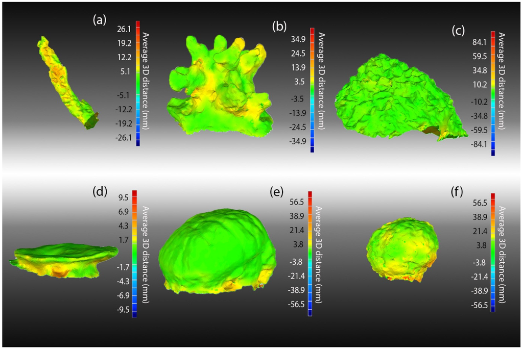 Precision analysis of 3D geometry of models of each morphology. The heatmap shows the spatial distribution of error (SD of average distance amongst models in mm) when all replicate models for each morphology were were compared using Geomagic Studio software deviation analysis. Morphologies are; (a) Bottlebrush; (b) Branching-coarse; (c) Foliose; (d) Tabulate; (e) Massive-medium; and (f) Massive-small. Areas where there was no model overlap are grey.