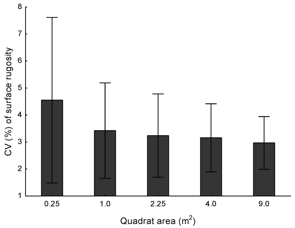 Comparison of the three models indicated they were, on average, about 25 mm different in most spots (Table 4). In some of the more complex areas however, this difference was ~90 mm (Figure 7). The SRs value estimated for the whole area differing by only a few percent in absolute value among the three models (Table 4). There was spatial variability in the precision with which SR was estimated but the magnitude of this variability did depend somewhat on the quadrat size used to calculate it. Using 0.25 m2 quadrats gave higher estimates of error in some regions leading to a higher overall average error value for the domain and a greater spread of values (Figure 8), though at 4.5% CV, the error is relatively low. For quadrat areas greater than this, the average error was smaller and quite similar, ranging between 3%–3.5%. Looking more closely at the quadrat size with the most replicates within this stable range, 1 m2, its clear that there are specific areas of the domain where error rates were much higher (Figure 9). These areas of low precision do not seem to be especially structurally complex based on a non-significant regression of the average SR (independent) against the CV of all SR values (dependent) for each 1 m2 quadrat (t112 = −0.120, p = 0.91, r2 = 0.001).