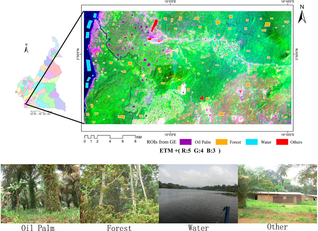 Oil palm (Elaeis guineensis Jacq.) is one of the most productive vegetable oil crops in the world. It was reported that oil palm plantations have an average annual production of 3.5 tons of edible oil per hectare [1] in the humid tropical lowland rainforest regions of the world. In addition, the development of high-yield varieties has made oil palm planting a lucrative and profitable agricultural pursuit. Such significant economic value is attractive, and has driven extensive land cover change in the humid forest zones of Cameroon. The southwest, south and littoral areas of Cameroon have been the most attractive regions for investors. After drastic price drops for cocoa and coffee in Cameroon, many small- and medium-sized farms invested in palm oil production, and it was reported [2] that the area of oil palm plantations had steadily increased over the period of 2003–2010. The area of oil palm plantations owned by small and medium farms increased from 50,000 ha in 2003 to 98,000 ha in 2010; the area of oil palm plantation owned by large-scale agro-industrial estates increased from 115,000 ha to 170,000 ha [2].A recent survey reported a total area of 190,000 ha and a total production of 230,000 tons of crude palm oil in Cameroon [3]. Because of the increasing global demand and good bioclimatic conditions in some parts of Cameroon for high production of oil palm, it is likely that the area of oil palm plantations will continue to increase in Cameroon in the next few decades.