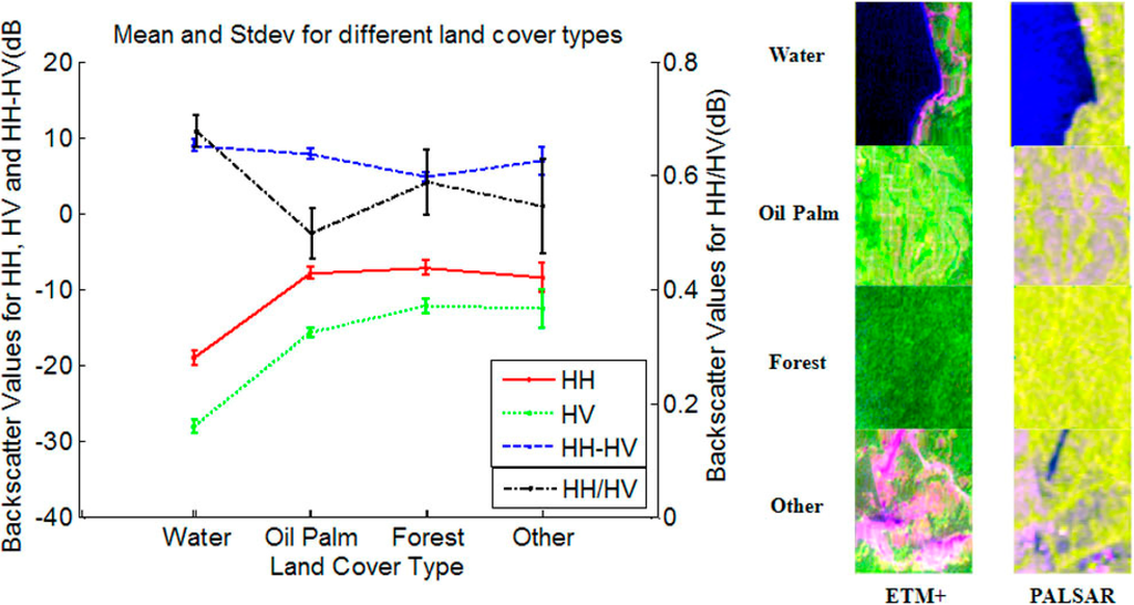 A comparison between statistical value of different land cover types. The backscatter statistical character of buildup land cover type is given to stand for “other” land cover type.
