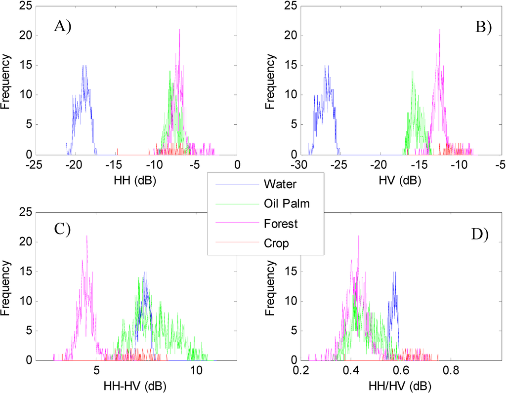 To obtain the desired classification result, it is necessary to understand the backscatter signatures of various land cover types. Many factors such as polarization, frequency, surface roughness, geometric shape (e.g., inclination of land surface) and dielectric properties of the target will affect microwave backscatter values. L-band PALSAR penetrates far more than C or X-band [44], and is more sensitive to the structure and the size of trunks, branches and leaves. Oil palm has no branches but it has a trunk and leaves, so oil palm is readily recognized in PALSAR images. To compare the difference between oil palm plantation and other land cover types, we calculated the mean and standard deviation of ROIs using the HH, HV, ratio and difference images (Figure 3). Water has the lowest values in HH and HV because of absorption and mirror reflection, but the highest values in the difference and the ratio values, compared to the other three land cover types. Thus, water can be easily identified. Oil palm has HH and HV values between water and forest although closer to forest, but higher difference values and lower ratio values than those of forest. Note that the difference in the ratio values among different land cover types is of too small an order of magnitude to recognize. Therefore, even though the HH/HV ratio values of oil palm are the lowest, it is not easy to pick up oil palm based on the HH/HV ratio values. To further understand these characteristics, especially of oil palm, the histograms of the HH image, HV image, the ratio image and the difference image for different land-cover types are shown in Figure 4, which verifies that water has the lowest backscatter values. Though oil palm and natural forest have partially overlapped HH data, oil palm has lower HV backscatter data than natural forest, which is mainly caused by their differences in branch, trunk, and canopy. At the same time, natural forest has very low difference values (HH-HV image) and is separable from oil palm plantations at the value of 6.5 or so, which is consistent with the results of previous work [28]. Therefore, taking both the HV values and HH-HV difference values into account, oil palm plantations can be separated from natural forests and other type.