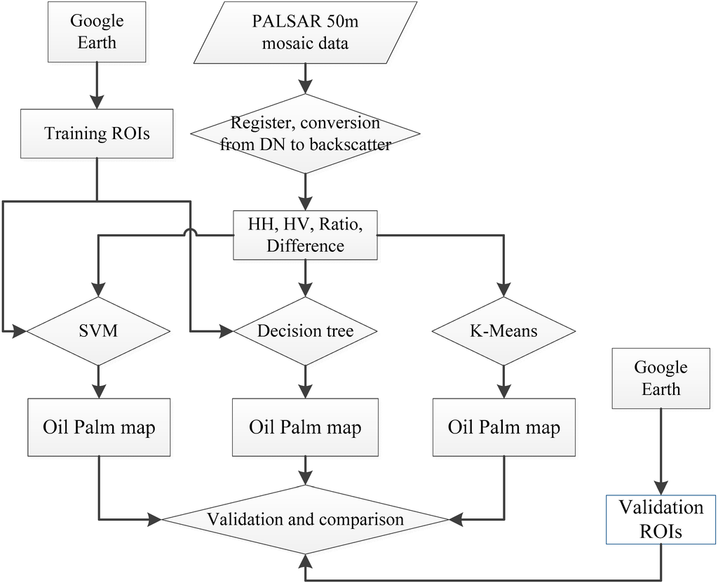 The objective of this study is twofold: (1) to evaluate the potential of PALSAR imagery to map oil palm plantations in Cameroon and (2) to evaluate the effectiveness of various classification methods in the use of PALSAR data. We implemented Support Vector Machine (SVM), K-Means, and Decision Tree methods to map oil palm plantations in a small region in Cameroon. To assess the performance of various classification methods, we randomly selected training samples of different sample sizes from a large set of training points. We aimed to provide feasible algorithm selection reference of oil palm plantation mapping with PALSAR data [31].