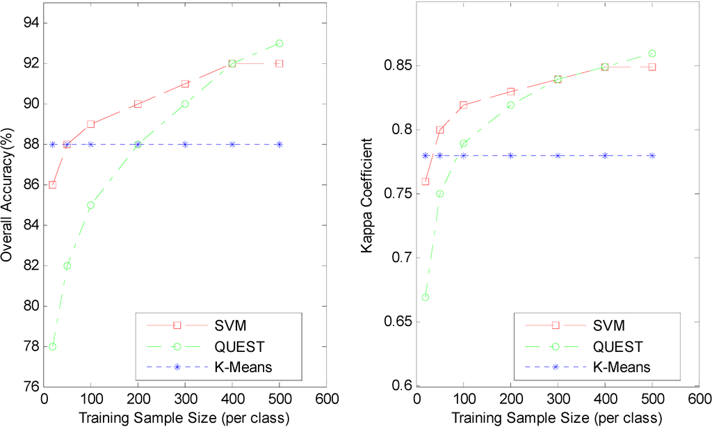 According to the overall accuracies and Kappa coefficients, the performance of SVM exceeded QUEST and K-Means for almost all given training sample sizes. For big training sizes (i.e., no less than 500 pixels per class), the overall accuracy and Kappa coefficient of SVM were 92% and 0.85, respectively. SVM’s results were almost the same as those of QUEST (93% for overall accuracy and 0.86 for Kappa coefficient) and slightly outperformed those of K-Means (88% for overall accuracy and 0.78 for Kappa coefficient). When the training sample size was smaller, the SVM and K-Means methods had higher overall accuracies and Kappa coefficients, with superior overall accuracies 8% above QUEST. For the QUEST method, when the training samples increased, accuracy performance improved rapidly. When the training size was big enough (more than 500 pixels per class), QUEST and SVM were similarly accurate, and better than the K-Means method. The same trends appeared in Kappa coefficients as in the overall accuracies. It is obvious that training sample size had less of an impact on the SVM classification than on Decision Tree (QUEST). The overall accuracies and Kappa coefficients suggest that SVM exceeded the other two classification methods.