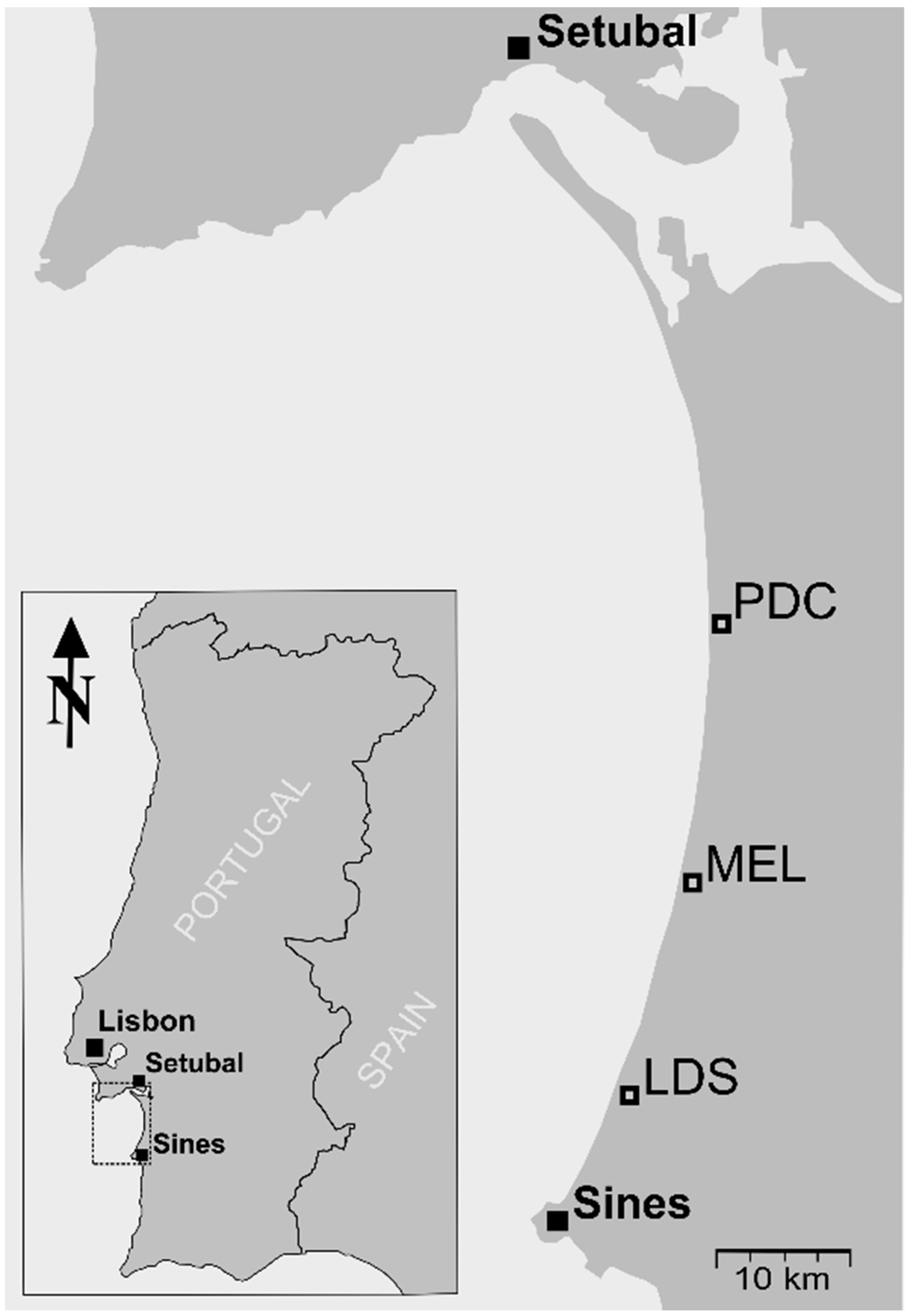 The study area is located at the Atlantic coast of southwest Portugal in the Alentejo region between Sines (37° 57′ N, 8° 52′ W) and Pinheiro da Cruz (38° 15′ N, 8° 46′ W). One 1-km2 plot was established in open sand dunes at three study sites running from south to north along the coast: Lagoa da Sancha (LDS), Melides (MEL) and Pinheiro da Cruz (PDC) (Figure 1). The local climate is Mediterranean with Atlantic influence. The mean annual temperature is 16.1 °C, and average yearly precipitation is 735 mm (meteorological station at Setubal, 38° 31′ N, 08° 54′ W, for the period between 1960 and 1990). The summer periods are generally dominated by drought and high temperatures. The native plant communities in the open dunes are mostly characterized by xerophytic plants, predominantly by sclerophyllous shrubs and isolated pine trees [16,26]. Furthermore, the study site is an important area for local endemic plant species [26,27] and protected by the NATURA 2000 habitats directive as “Comporta/Galé”.