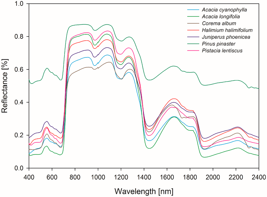 In this study, we aim to identify leaf spectral features that correspond to leaf tannin content of the non-native, invasive A. longifolia and six other abundant and common native and non-native shrub and tree species, namely Acacia cyanophylla Lindl. (non-native), Corema album (L.) D. Don ex Steud., Halimium halimifolium Willk., Juniperus phoenicea subsp. turbinata (Guss.) Parl., Pistacia lentiscus L. and Pinus pinea L. Furthermore, we want to distinguish non-native, invasive A. longifolia from the other species based on leaf spectral reflectance related to variation in tannin content in order to verify the potential for upscaling our results to airborne hyperspectral imagery.