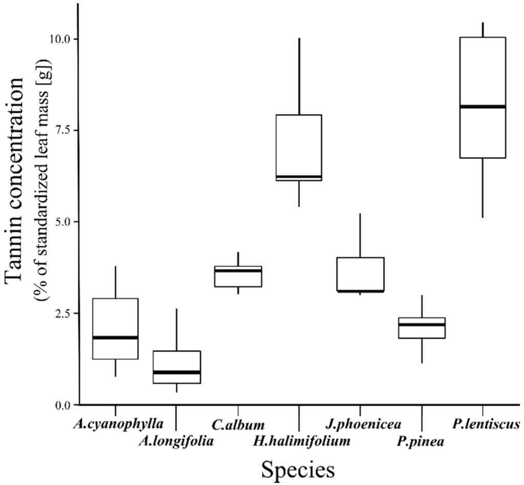 The boxplots show the tannin concentration of the selected plant species. The box represents the lower and upper quartiles and the median (black centered line), while the whiskers represent the maximum and minimum values.