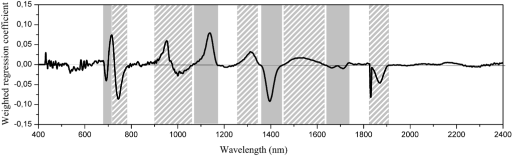 Weighted regression coefficients of the first derivative. The wavelengths of strong impact on the regression model are the ones with regression coefficients differing from zero and, therefore, are likely to be highly correlated with the tannin concentration. The importance of each identified region was tested by leaving out one region at a time. Regions of low impact on the calibration model were discarded for the classification model. Solid shading, selected wavelength regions for PCA-LDA. Striped shading, wavelength regions with low impact on the calibration model.