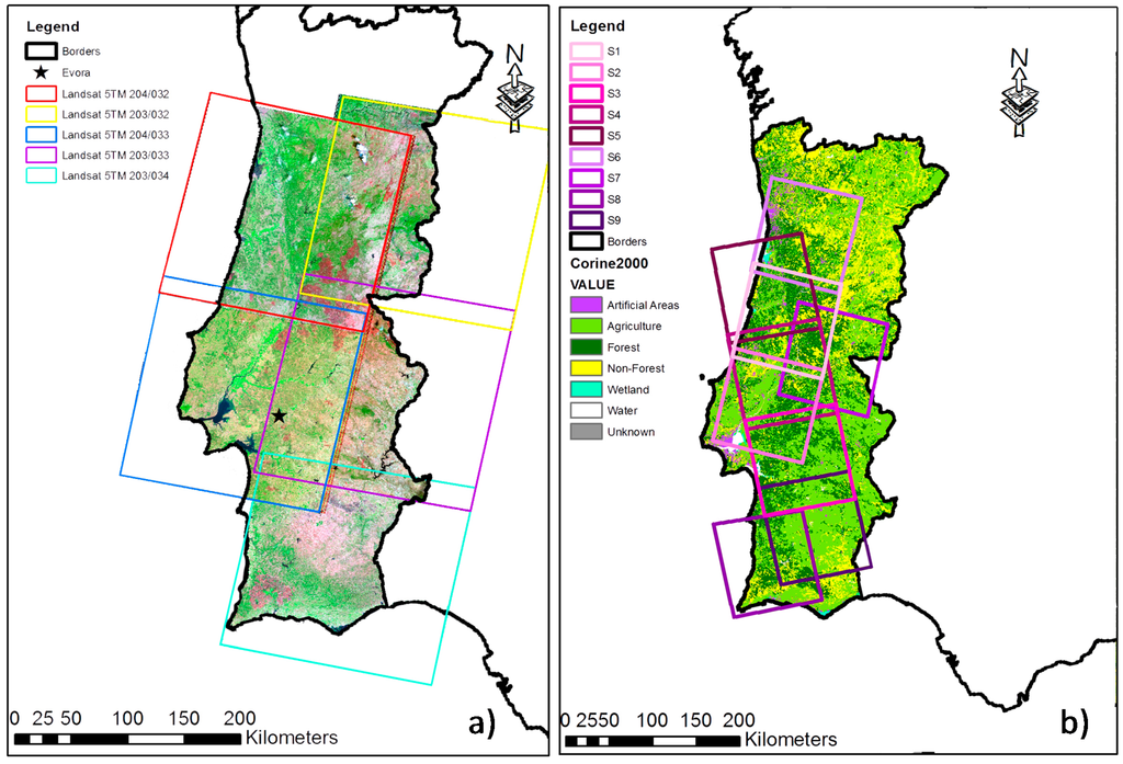 The Corine Land Cover map for the year 2006 (CLC2006) has been obtained from the European Environmental Agency website [], as a raster dataset with a spatial resolution of 100 m × 100 m providing information on the major land cover types over Europe. Figure 1b shows the level 1 land-cover classes over Portugal: artificial surfaces, agricultural areas, forest and semi-natural areas, wetlands and water bodies. The CLC2006 map has been used to derive for each TM frame a mask of those surfaces which are not likely to be affected by fires (also called “unburnable surfaces”) and identified by the following classes: artificial surfaces (level 1 CLC2006 codes 1–10), wetlands (level 1 CLC2006 codes 34–38) and water bodies (level 1 CLC2006 codes 39–43).