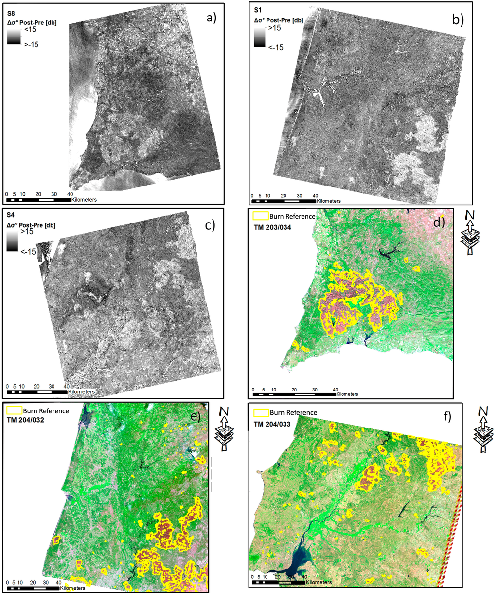 In boreal regions, earlier studies carried out with C-band ERS (European Remote Sensing) and RADARSAT data have highlighted a general increase in SAR backscattering over burned areas, as a consequence of exposed rough surface and increased soil moisture, mainly due to decreased surface albedo, permafrost melting and lowered evapotranspiration [,,]. For the Mediterranean region, distinct studies have been conducted for the identification of fire perimeters with C-band RADARSAT-1 [], ERS SAR [] data on Central Portugal, and L-band ALOS PALSAR (Advanced Land Observing Satellite Phased Array L-band Synthetic Aperture Radar) images on Greece []. The potential of SAR data to assess burn severity, fire damage and vegetation recovery has also been investigated [,,,]. The integration of optical and SAR data for burned area mapping has been addressed only in a few works [,,], despite the recognition of their complementary character [].